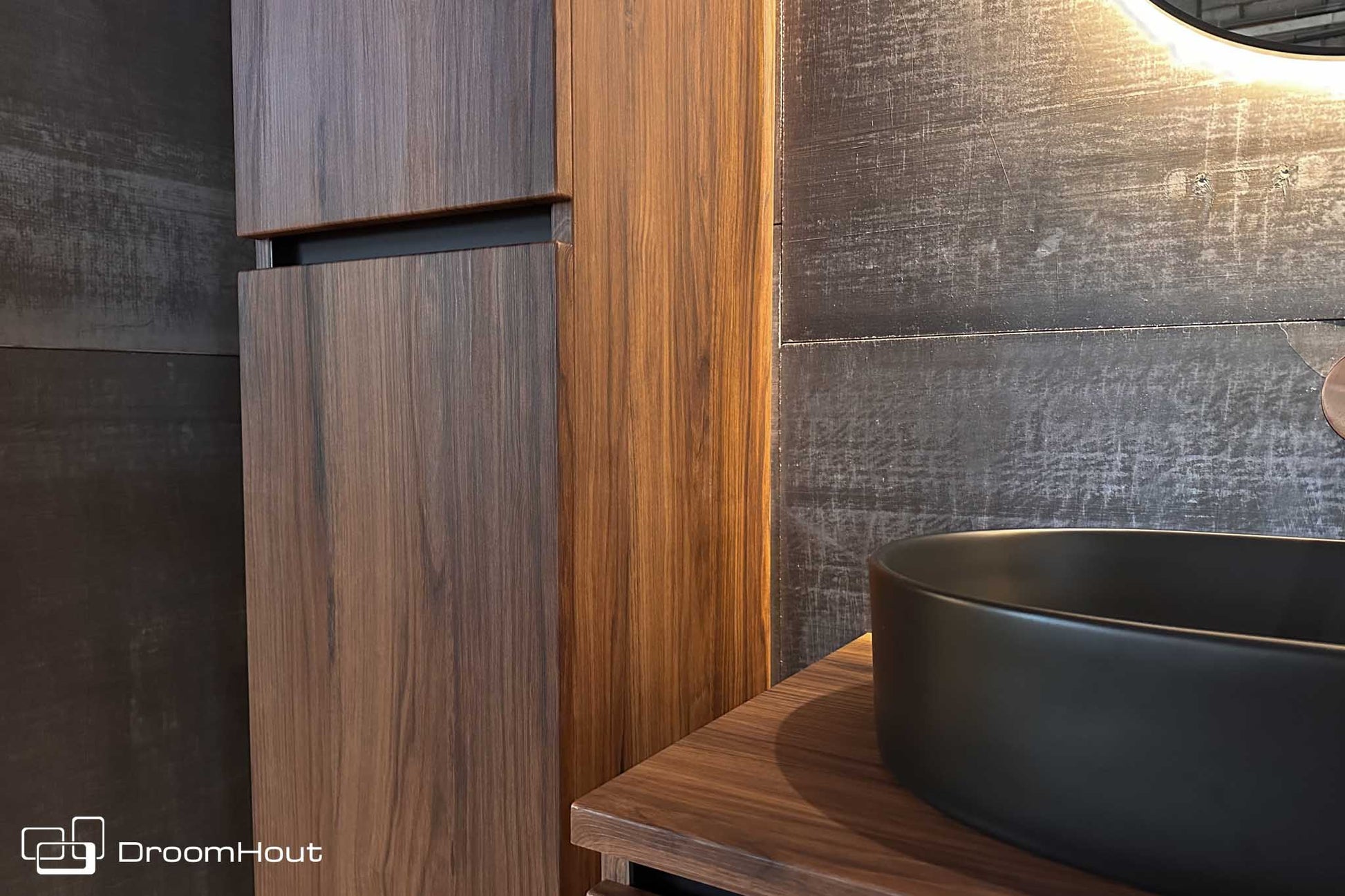 De Bliss badkamerkast is verkrijgbaar in een breed scala aan houttinten en afwerkingen. Of je nu de voorkeur geeft aan een warme houtlook en gaat voor katania eik (31). Zoals op de foto. Of juist een stoere betonlook, er is altijd een afwerking die bij jouw stijl past. Je kunt ook kiezen voor mat zwarte, aluminium kleurige of bijpassende grepen, zodat elk detail klopt. Maak je badkamer persoonlijk en stijlvol met de kleuren en afwerkingen die perfect aansluiten op jouw smaak.