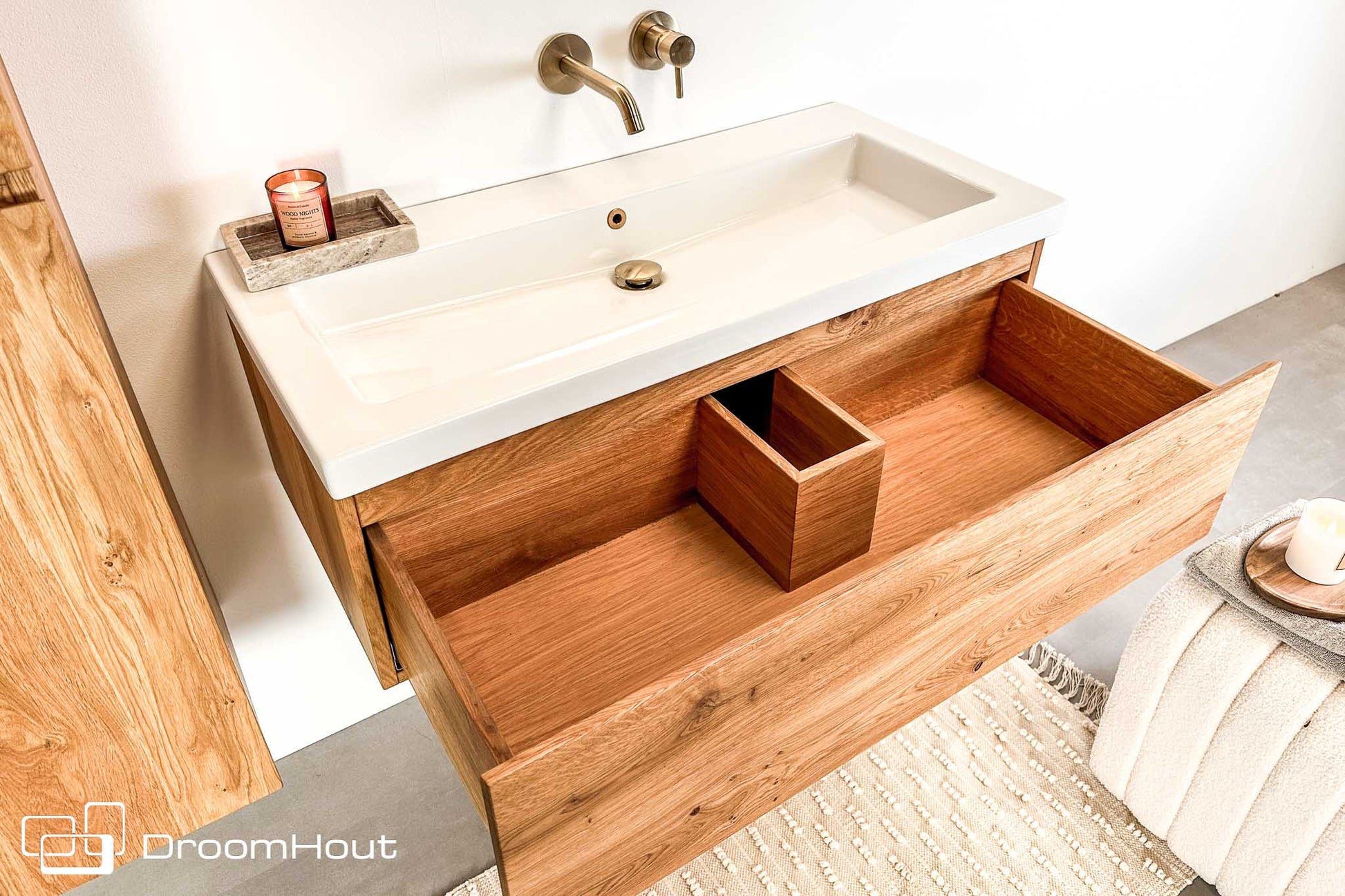Wij van DroomHout weten als geen ander hoe belangrijk het is dat de badkamer een fijne plek moet zijn om je dag te starten (en te eindigen). Met dat idee in ons achterhoofd hebben wij een badkamermeubel-lijn bedacht die de badkamer omtoveren tot een plek waar je graag bent. Een van deze meubels is de Aqua badkamermeubel, een prachtige badkamermeubel met 1 lade die een serene sfeer geeft aan elke badkamer! Ben je op zoek naar een meubel met 2 laden? óók die hebben we in onze lijn. Bijvoorbeeld het badkamermeubel Wellness van Droomhout.
