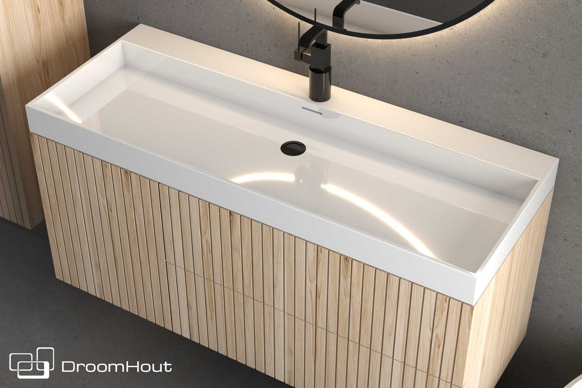 Wat een klasse en wat een stijl. Dit houten badkamermeubel Immaculate van eersteklas massief eikenhout of notenhout. Met super toffe latstructuur op het deurtje en de beide fronten. Echt een 'eye catcher' voor je badkamer. Dit houten badkamermeubel hang je gemakkelijk op aan je muur. Dat geeft een lekker ruimtelijk effect. Het meubel beschikt over twee schappen aan de linkerzijde met daarvoor het deurtje. Die zijn handig voor de wat grotere spullen en je tandenborstels. Rechts daarvan twee lades voor de losse en wat lagere spulletjes. Alles tip-on bediend dus door er op te drukken gaan ze open. Wat een parel dit houten badkamermeubel Immaculate met greeploze lades en fronten. En we leveren 'm helemaal compleet met ingebouwde sifon zodat je dit badkamermeubel direct kan gebruiken.