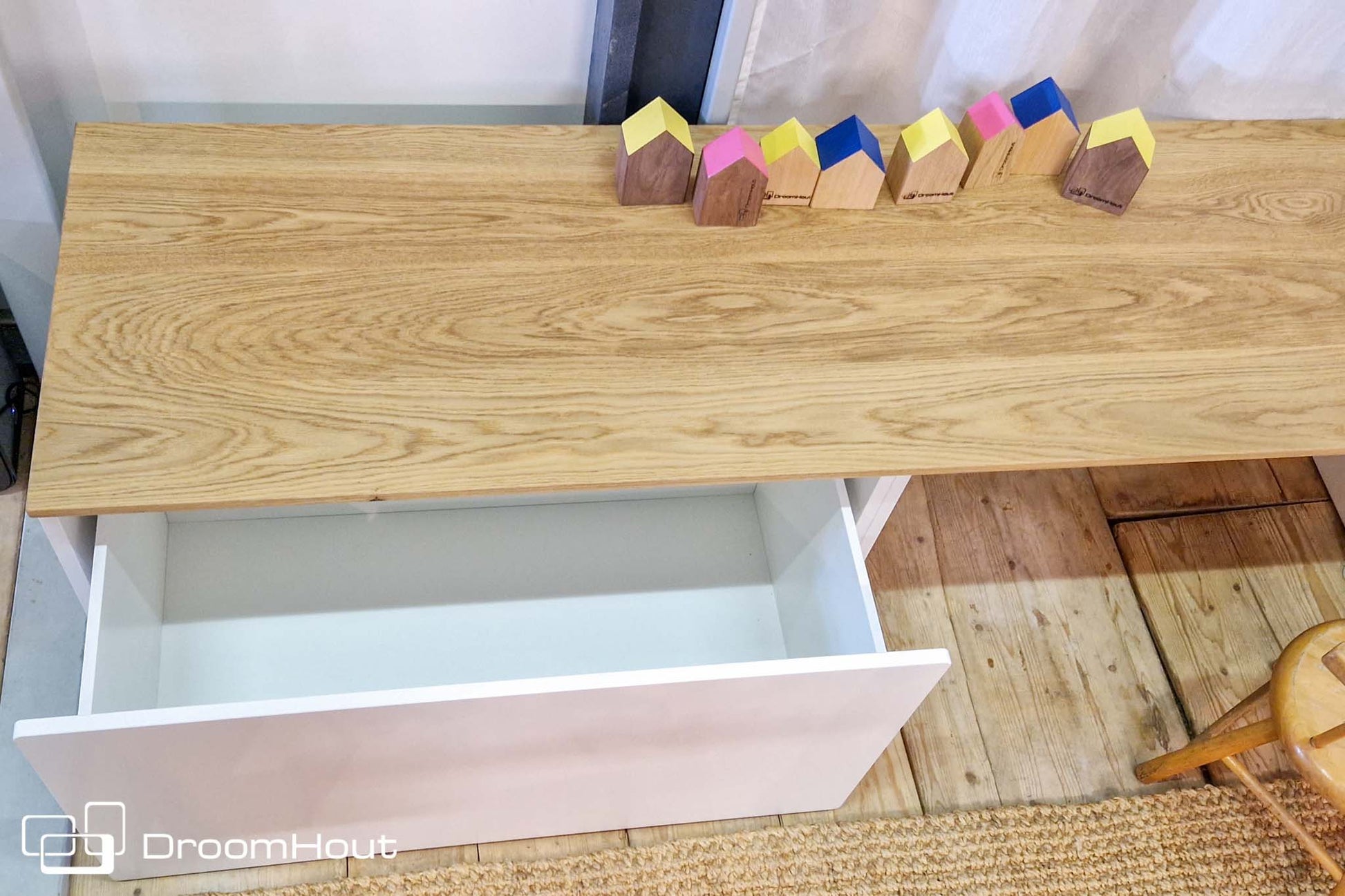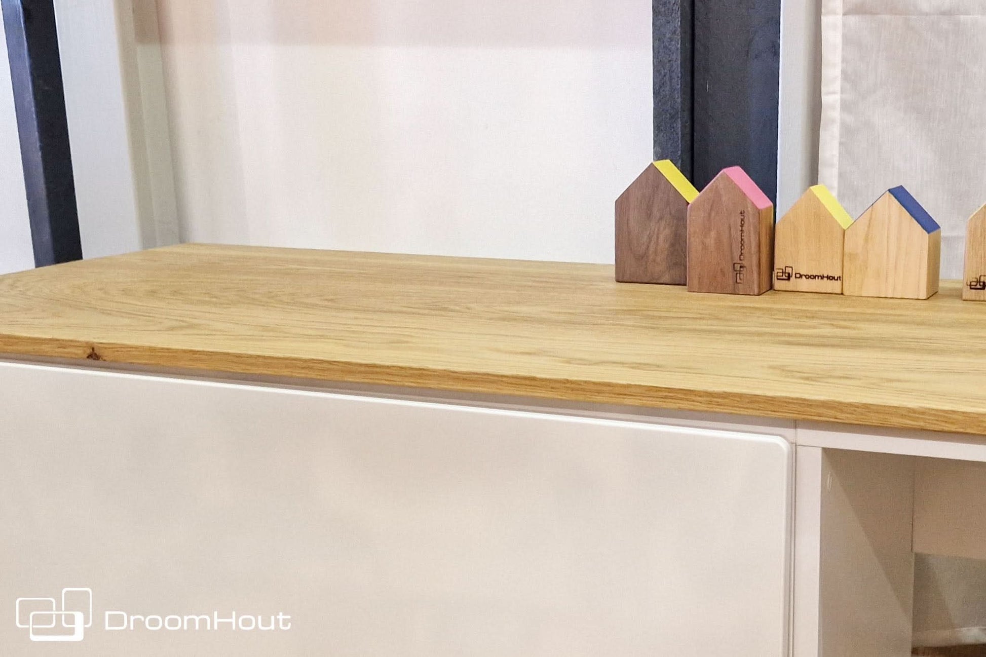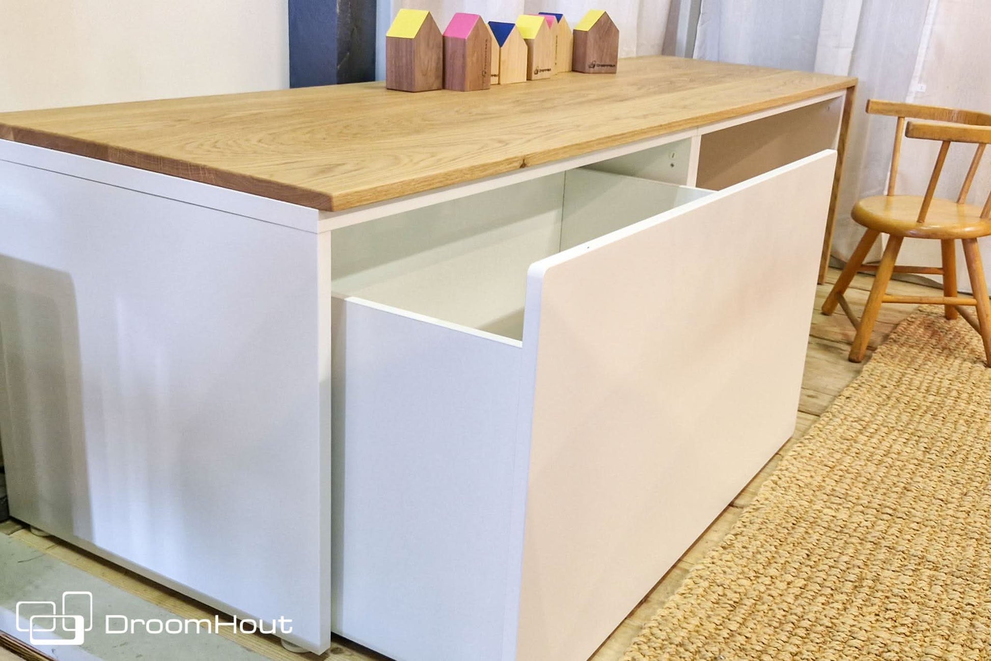 IKEA heeft handige kisten om speelgoed in op te bergen. Door een mooi massief eiken blad op de speelgoedkist te leggen creëer je een stylish verantwoord meubel wat mooi in de woonkamer past. Zeker ook een mooie combinatie met een IKEA BESTÅ TV-meubel!