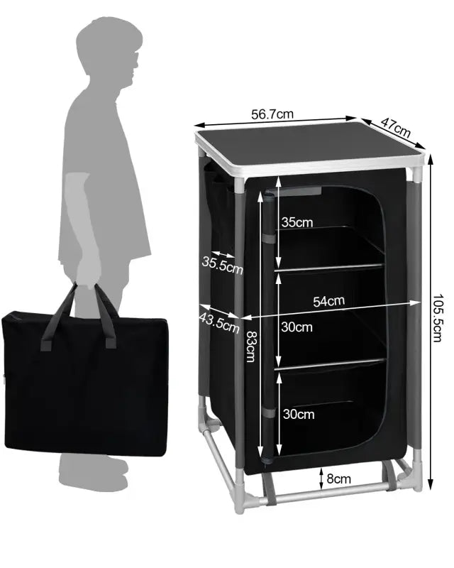De BukkitBow campingtafel onderscheidt zich door de geïntegreerde opbergmogelijkheden onder het tafelblad. De drie-laagse hangende opbergtas, voorzien van verwijderbare schappen, biedt voldoende ruimte voor het organiseren en opbergen van jouw spullen. Of het nu gaat om voedsel, kookgerei of andere benodigdheden, alles blijft netjes en binnen handbereik. De ritsdeur beschermt je spullen tegen stof, terwijl het mesh-materiaal zorgt voor een goede luchtcirculatie, zodat alles fris blijft. Bovendien zijn er drie zijvakken beschikbaar voor het opbergen van kleinere items zoals messen, vorken of kruiden, waardoor je altijd gemakkelijk toegang hebt tot wat je nodig hebt.