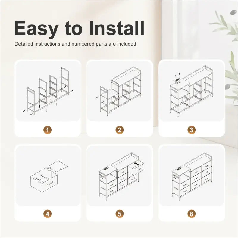 De BukkitBow Vintage Ladekast biedt veelzijdige opbergruimte met 8 stoffen laden, elk ontworpen om een groot aantal kledingstukken te huisvesten, zoals sokken, T-shirts en jeans. Daarnaast beschikt de kast over een open compartiment en twee werkbladen voor vaak gebruikte voorwerpen. Met twee haken aan de zijkant kunnen sleutels, tassen en andere kleine items netjes worden opgehangen.