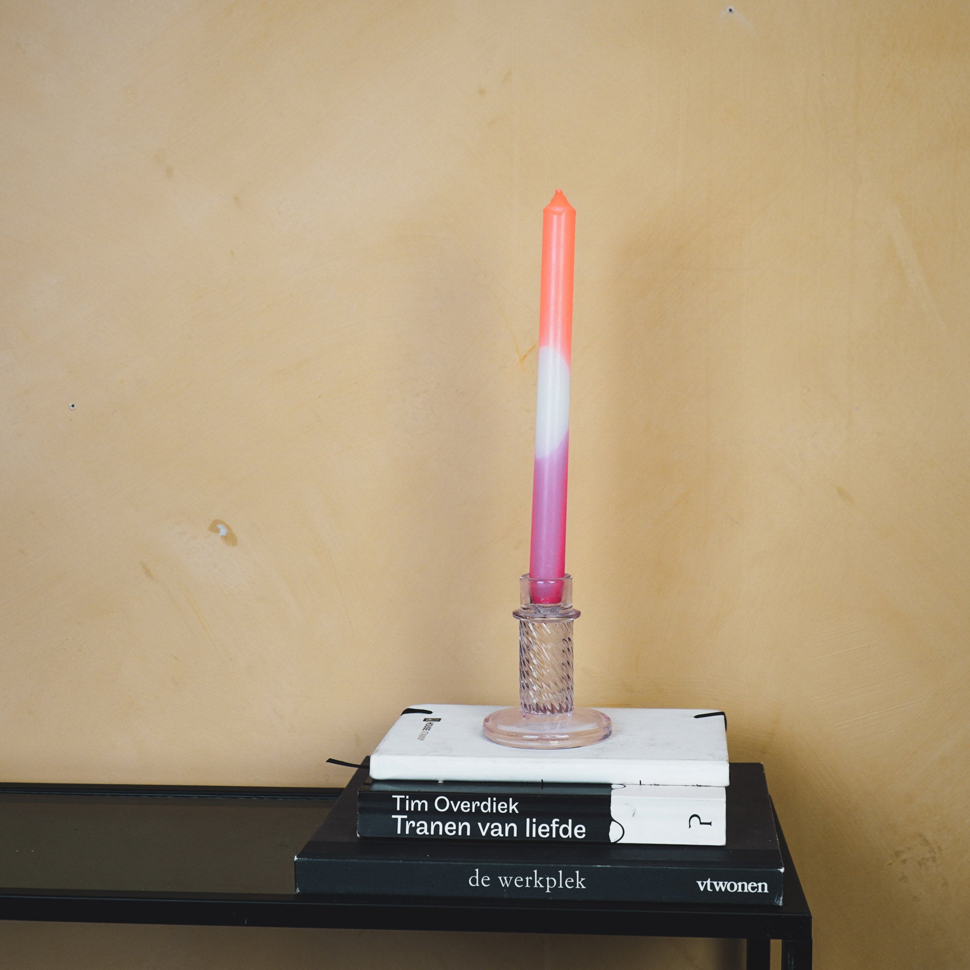 Ben je op zoek naar een stijlvolle toevoeging aan je interieur? Deze prachtige kaarshouder-kandelaar van Housevitamin is precies wat je nodig hebt! Gemaakt van glas met een mooi reliëf, deze roze kaarshouder is de perfecte combinatie van elegantie en modern design. Voeg wat sfeer toe aan je woning met deze mooie kaarshouder!