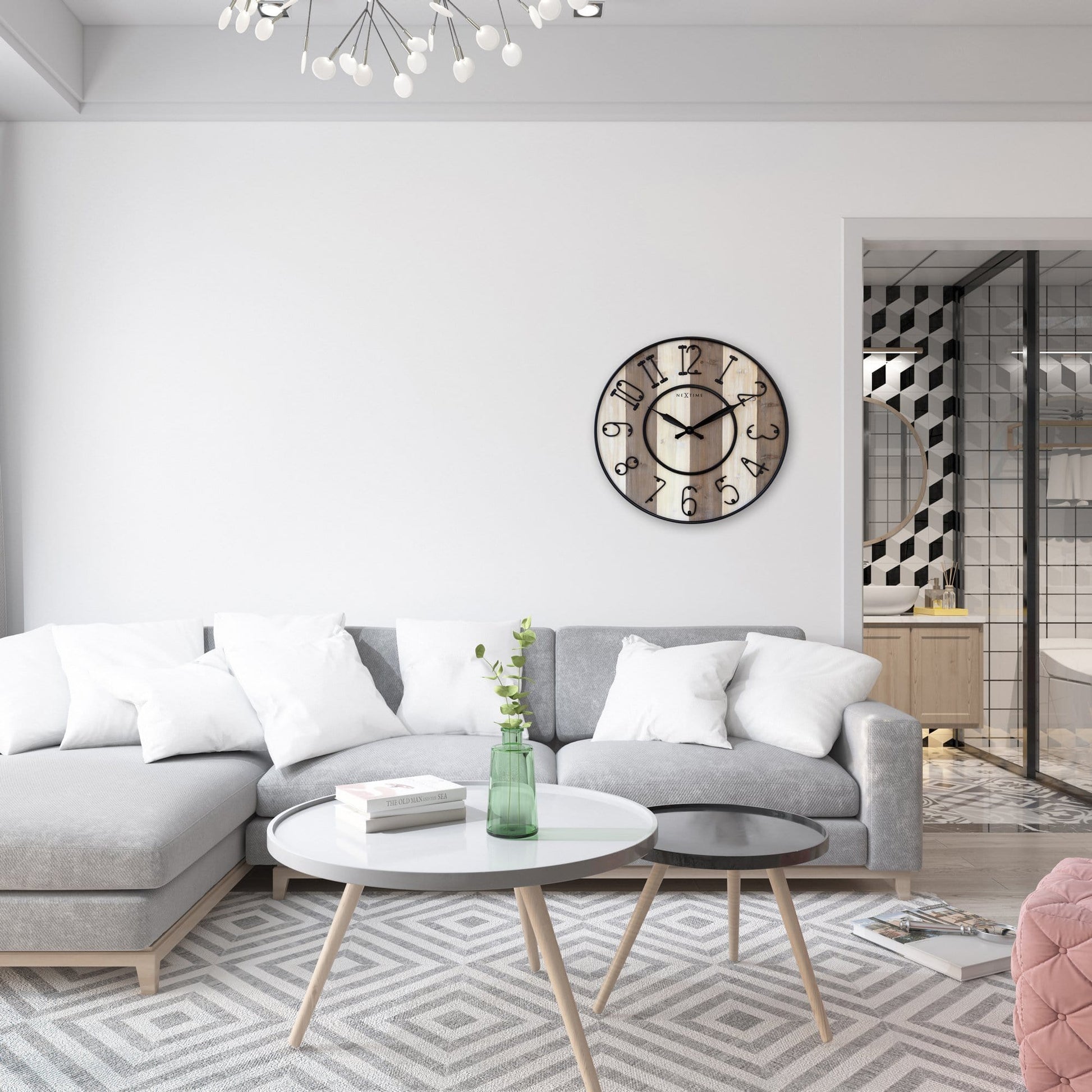 This NeXtime "Oxford" wall clock ( 50cm) radiates farmhouse elegance with robust details; the double metal rings make the clock stand out further. This clock has a beautiful light brown and off white linear pattern on the dial, and a set of classic black hands. Each clock face is unique reflecting the grain of the wood it was made from. The bold metal index allows you to read time with ease, even across the room. This clock is silent and runs on 1x AA battery (not included)