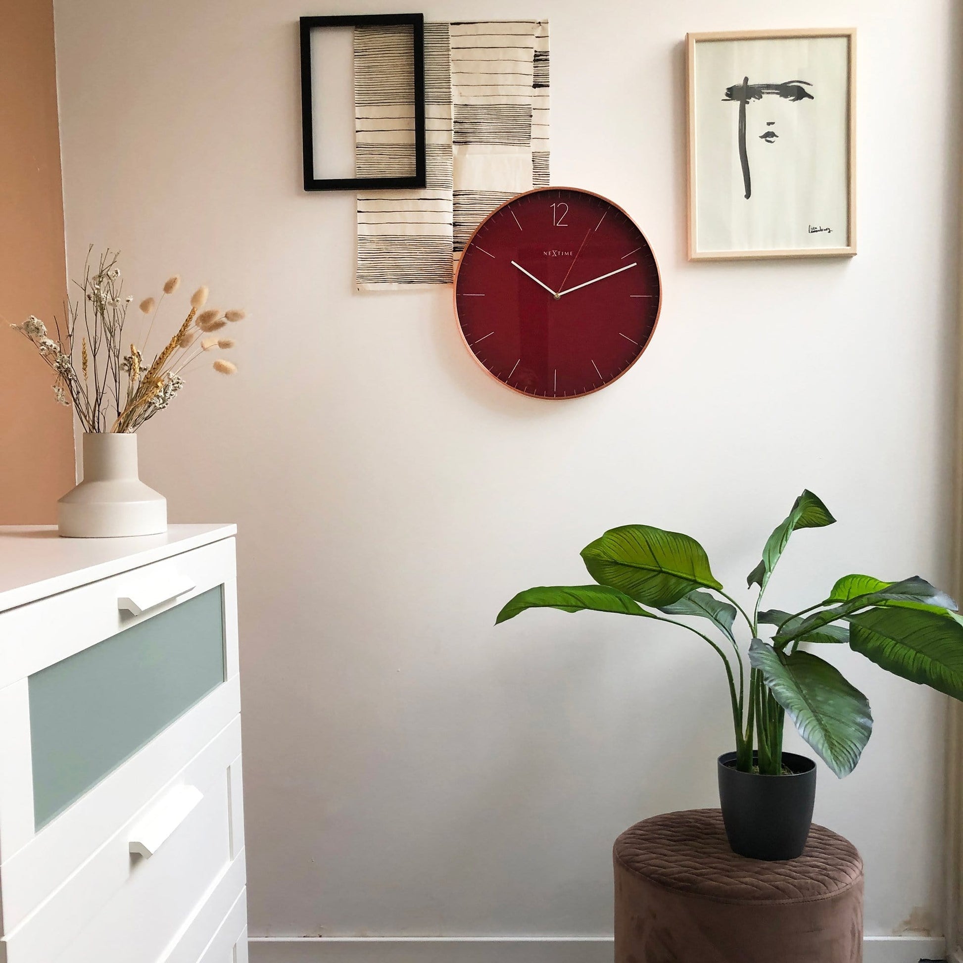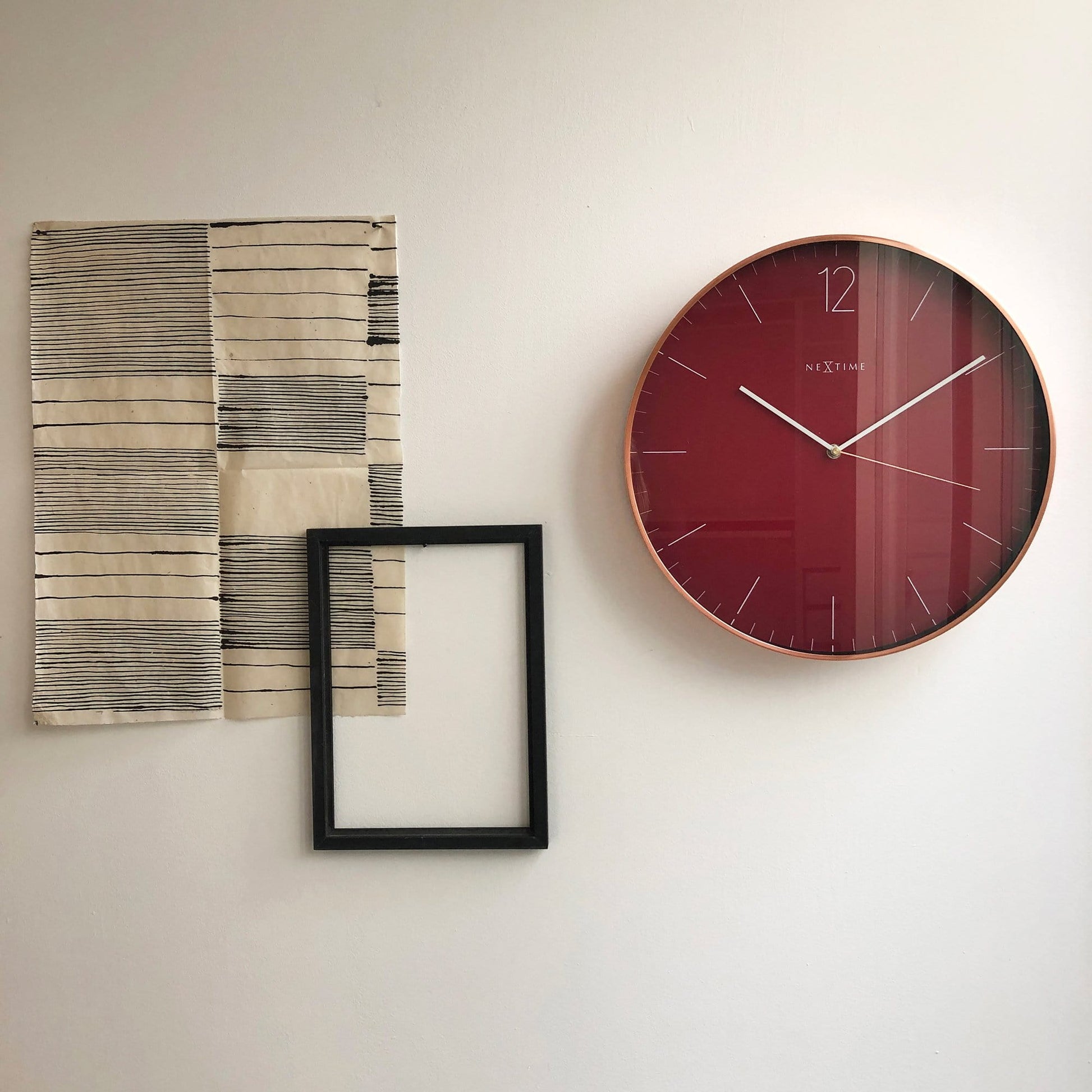 The NeXtime "Essential Copper" is a lovely eyecather due to its size (40cm) and striking colour. The clock has a copper coloured case made of brushed aluminium, a red dial with a light red stripe index and a number at 12 o'clock. The thin hands and second hand gives this clock a lovely chic and stylish design that fits in many interiors. This clock is silent and works on 1 AA battery (not included).