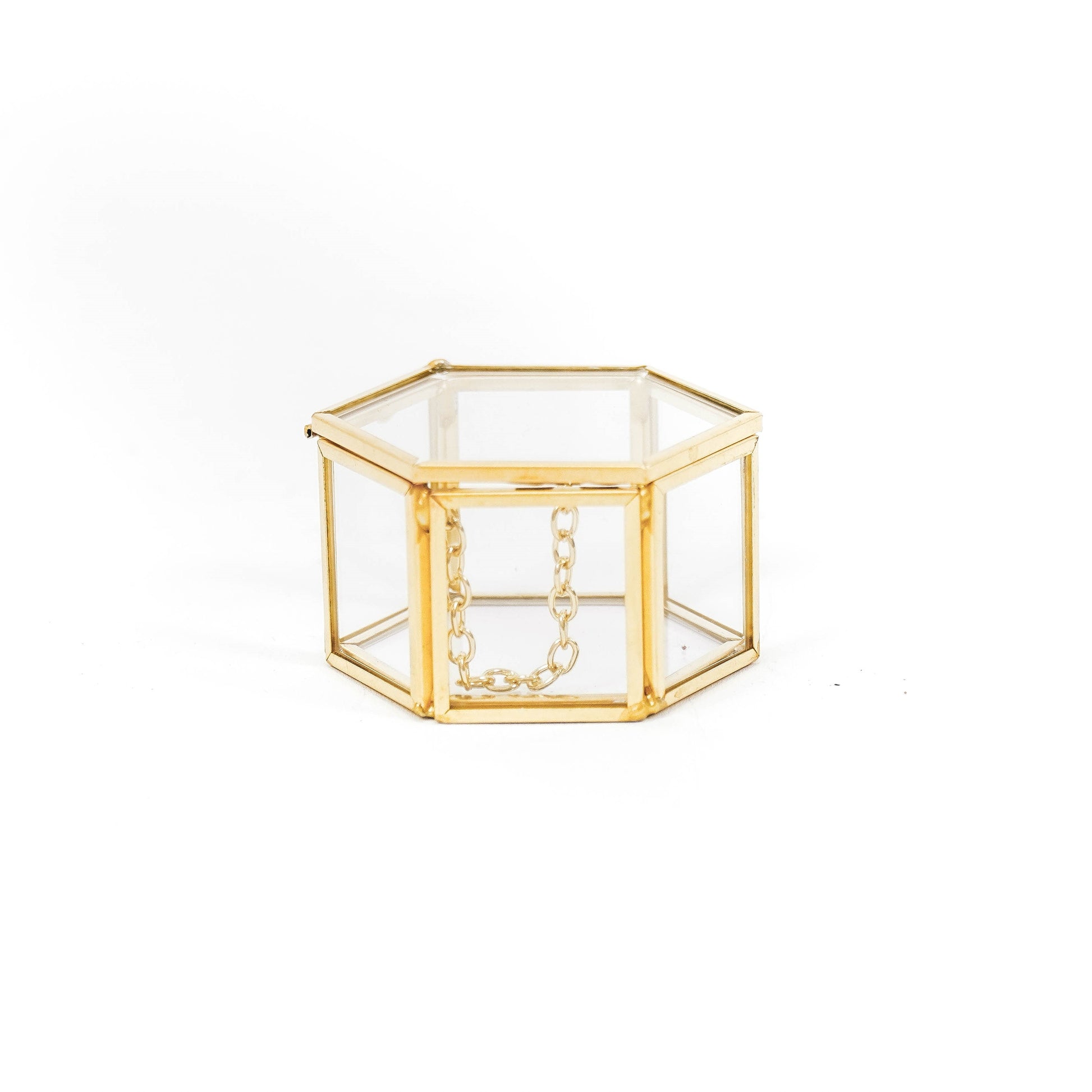 PERFECTE COMBI - Metaal en glas is zo'n perfecte combinatie! De voor- en achterkant is van glas en daardoor gemakkelijk te plaatsen en iets te laten zien binnenin. Creëer je eigen kunstwerk door er een veer of bloem in te stoppen. Op zoek naar een stijlvolle opbergoplossing? Dit prachtige gouden glazen boxje van Housevitamin is perfect voor het tentoonstellen van je favoriete kleine objecten. Gemaakt van metaal en glas, met een handige deksel voor extra bescherming. Met de afmeting van 6x5,5x3,5cm past deze hexagonale doos perfect in elk interieur. Laat je creativiteit de vrije loop en verander het decor met elk seizoen!