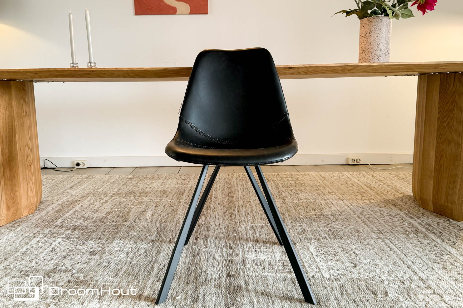 De Franky Chair heeft een zitting gemaakt van Vintage PU leer en heeft een onderstel van zwart gepoedercoat staal met beschermdoppen. Deze hippe stoel van Dutchbone is verkrijgbaar in het zwart en bruin. De afmetingen van de stoel zijn 83 x 46 x 56 cm (h x b x d). De zithoogte is 48 cm en de zitdiepte is 42 cm. De stoelen kun je bestellen per set van 2 stuks.