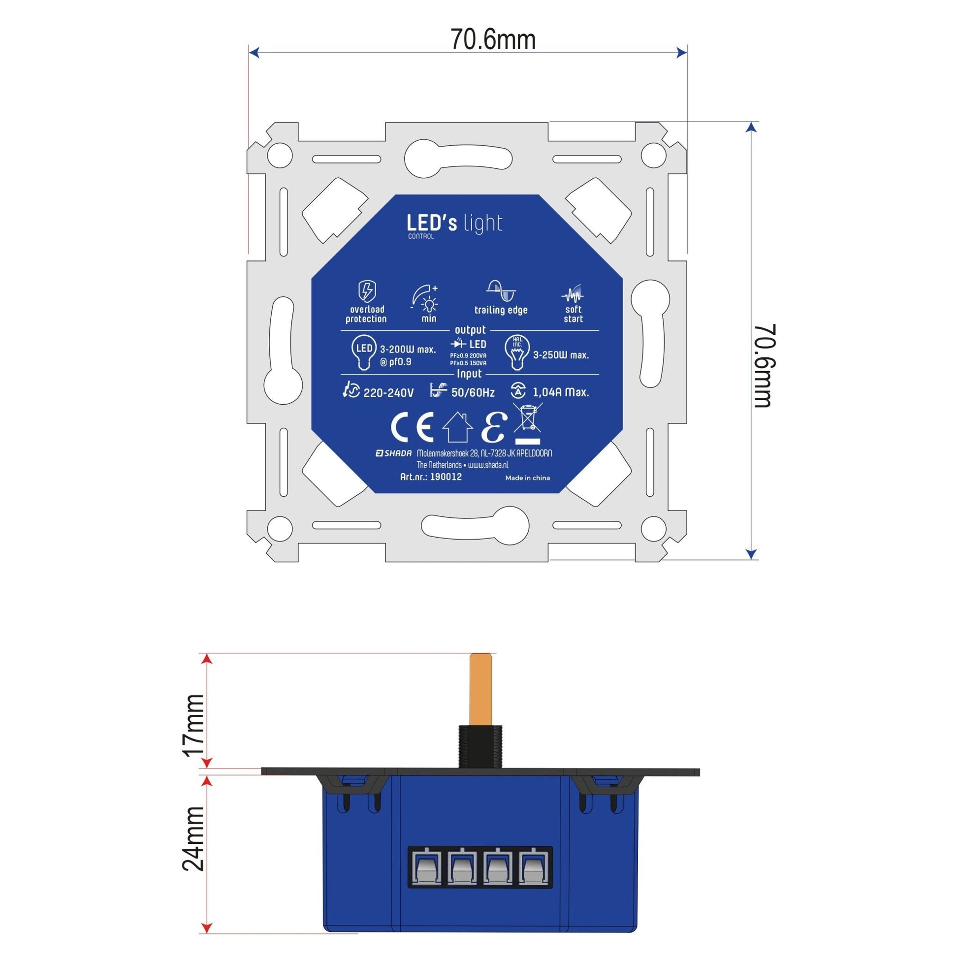 Deze dimmer is geschikt voor faseafsnijding- 2-draads systemen en heeft een inbouwhoogte/diepte van 25 mm. Het is ook compatibel met 2-draads systemen en 3-draads systemen. Met een maximaal vermogen van 250W is deze dimmer krachtig genoeg voor verschillende soorten verlichting.