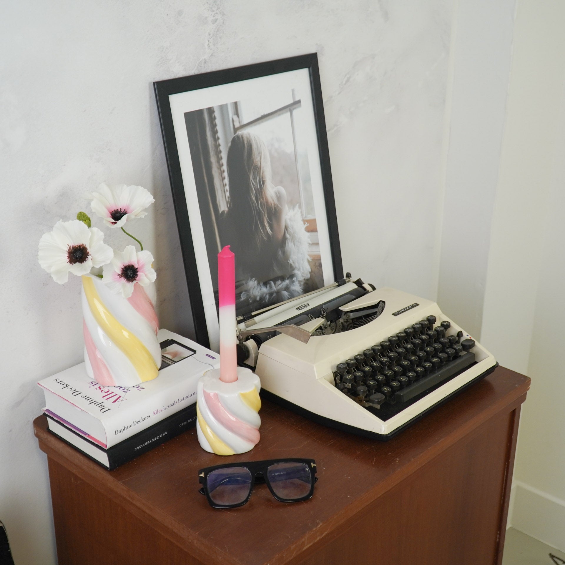 Maak het geheel extra vrolijk door de vaas te vullen met bloemen in pastelkleuren, zoals pioenrozen, tulpen of ranonkels. Combineer de vaas met andere kleurrijke accessoires of zet hem op een dienblad met (nep)snoepjes voor een onweerstaanbaar zoet hoekje. Zo wordt deze kabel spek vaas hét stralende middelpunt van je kamer!