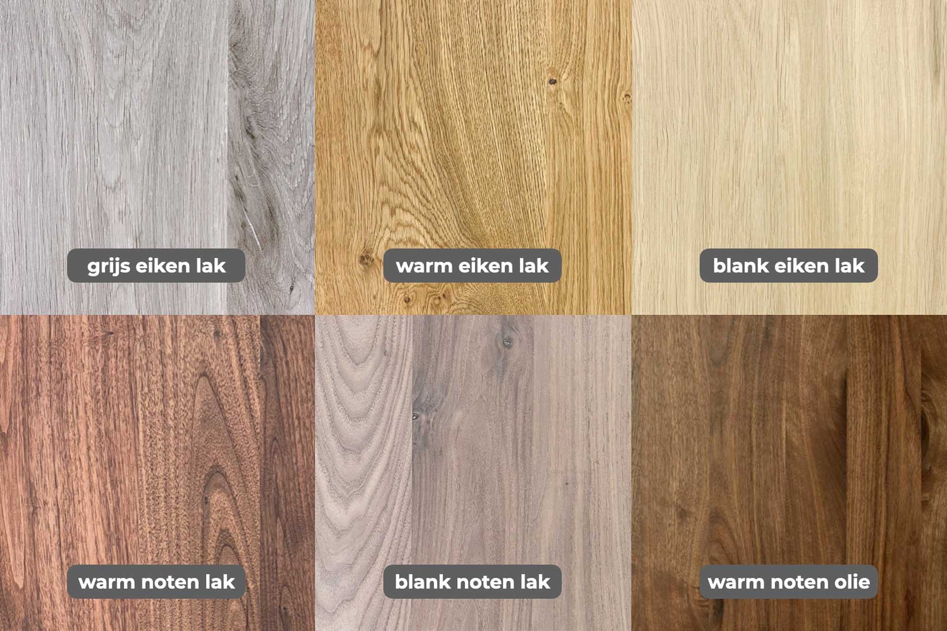 Kies uit 6 fantastische kleuren eiken- of notenhout. Een koele strakke uitstraling krijg je door het hout in wat lichter eiken te kiezen. Wanneer je juist wat warmte aan je ruimte wilt toevoegen kies je voor warmere eiken- of notentinten. Het hout wordt behandeld met een supersterke 2-componenten matte lak of olie. Hou je van de minimalistische Scandinavische look, laat het eiken dan zijn natuurlijke uitstraling behouden en kies voor blank eiken lak. Het hout lijkt dan onbehandeld, maar is beschermd tegen vlekken.