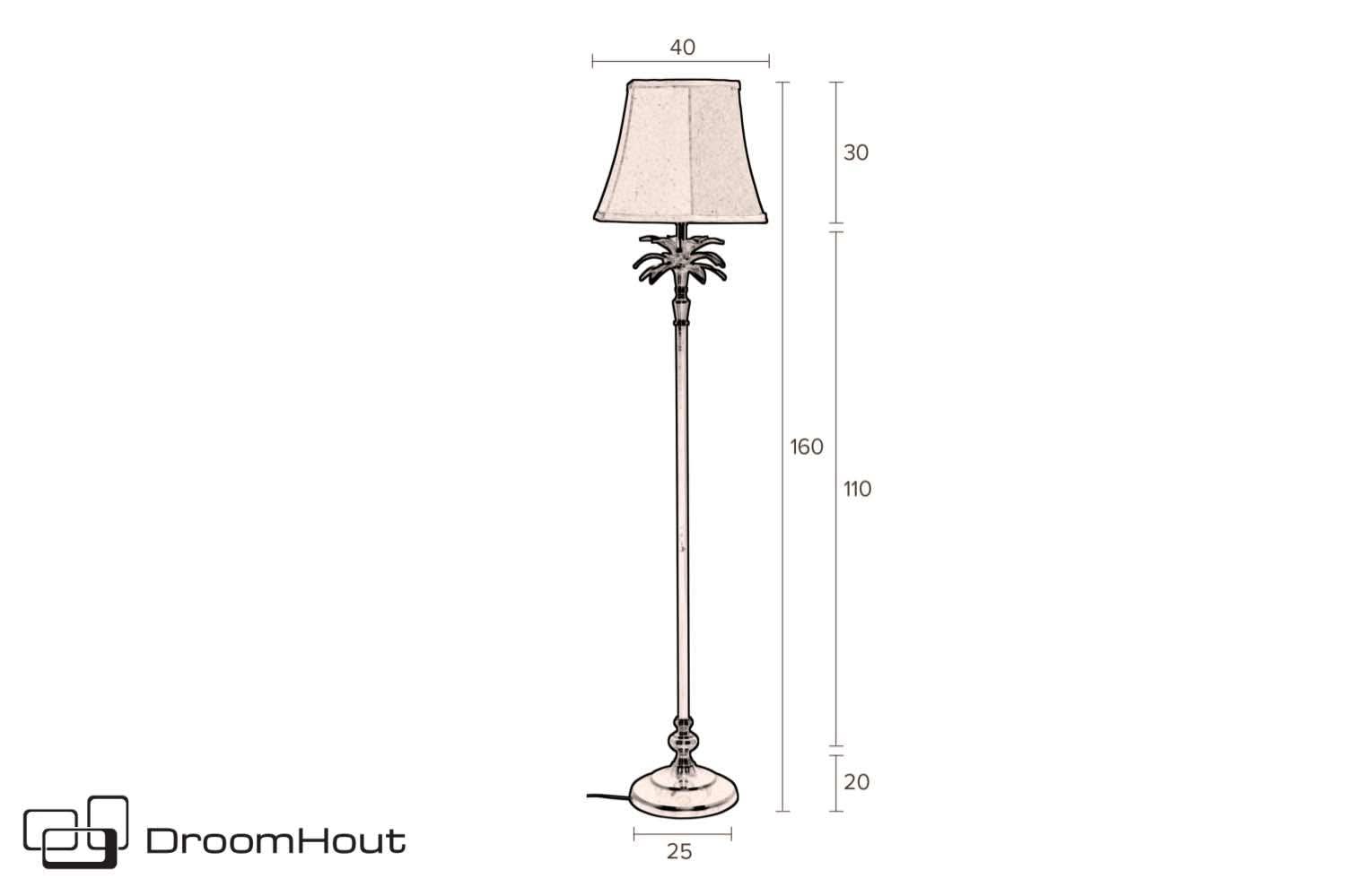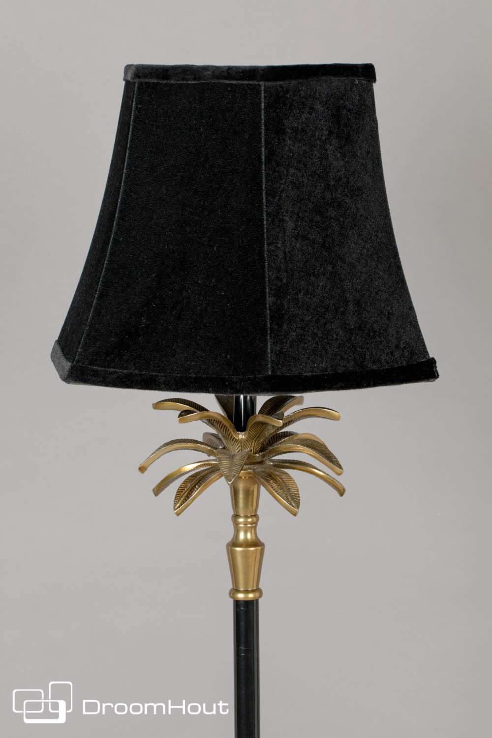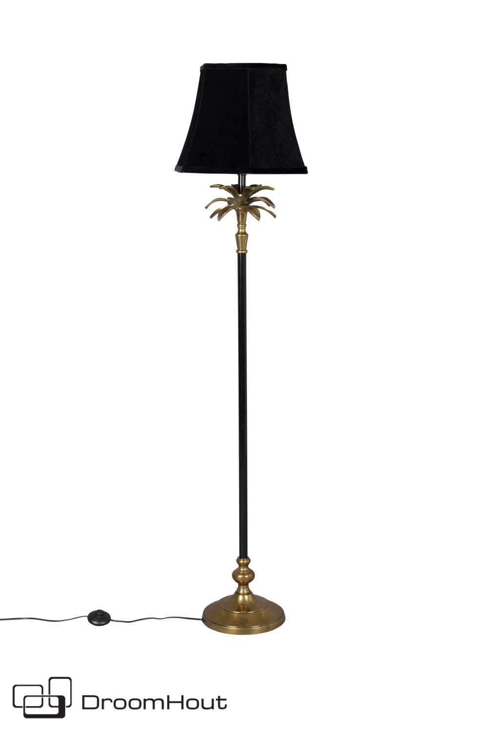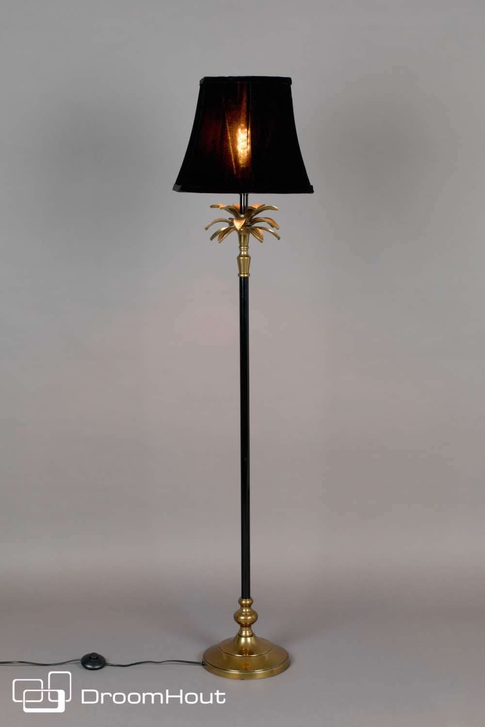 De exotische look van vloerlamp Cresta is ook in het materiaal gebruik terug te vinden. De zwarte staander staat op een messing look voet met mooie details in de vorm. De staander heeft boven in een gave kraag van palmbladeren. Echt een kunstwerk. Op deze staander staat een chique fluwelen zwarte kap. Deze zorgt voor een aangenaam zacht licht. Het frame is van gepoedercoat aluminium met goudlaag. De fluwelen kap heeft een afmeting van ø 40 x 30 cm en is van 100% polyester. Aan de voet van ø 20 x 25 cm is een 350 cm zwart PVC snoer met aan / uit voetschakelaar bevestigd. De totale afmeting van vloerlamp Cresta is 25 x 25 x 131 cm (BxDxH).