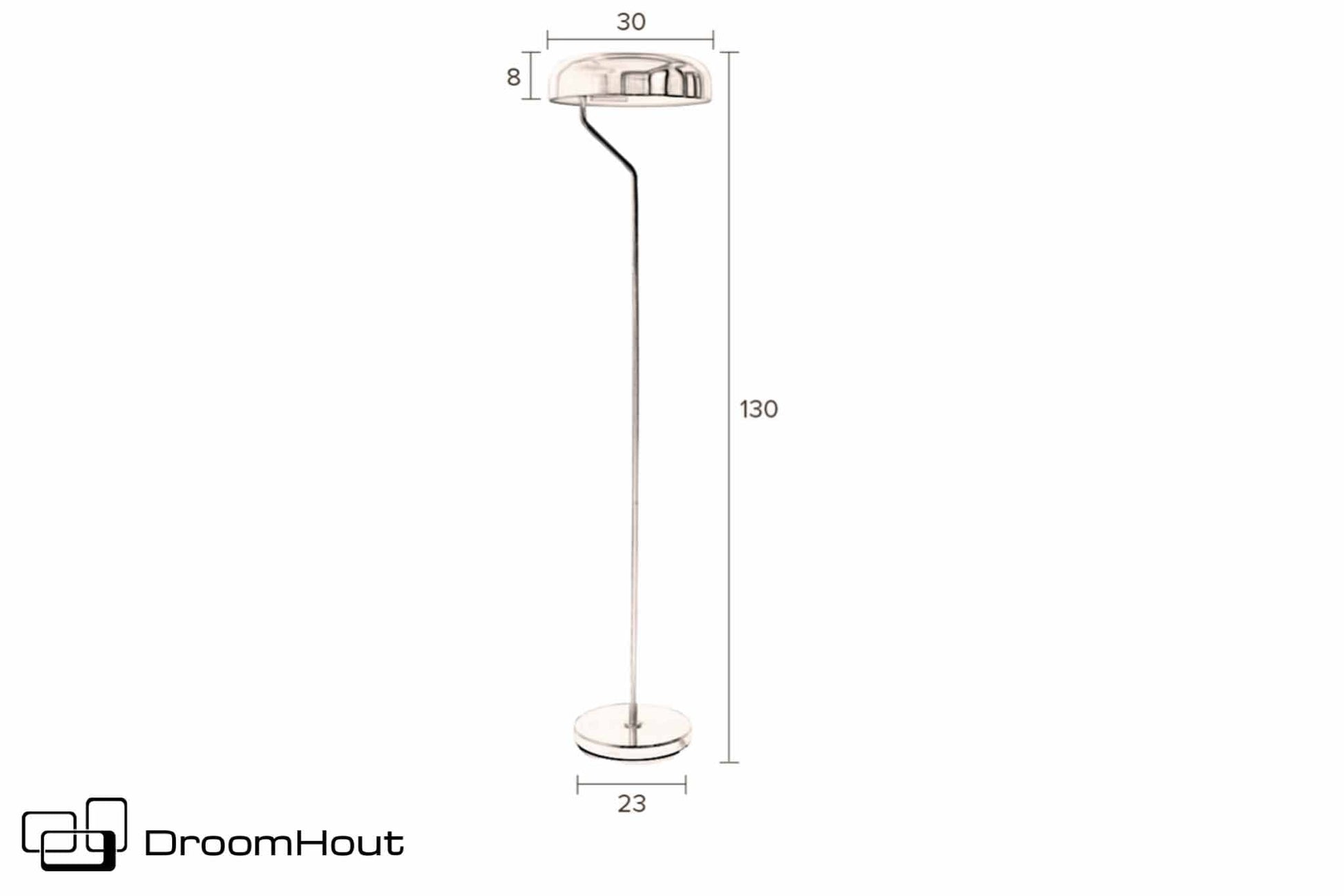 De lamp is voorzien van een lekker lang zwart snoer van 183 cm lang, deze is voorzien van een handige voetschakelaar. De totale hoogte van de lamp is 130 cm. De kap heeft een diameter van 30 cm en is 8 cm hoog. Het ronde plateau heeft een diameter van 23 cm en is 2,5 cm hoog.