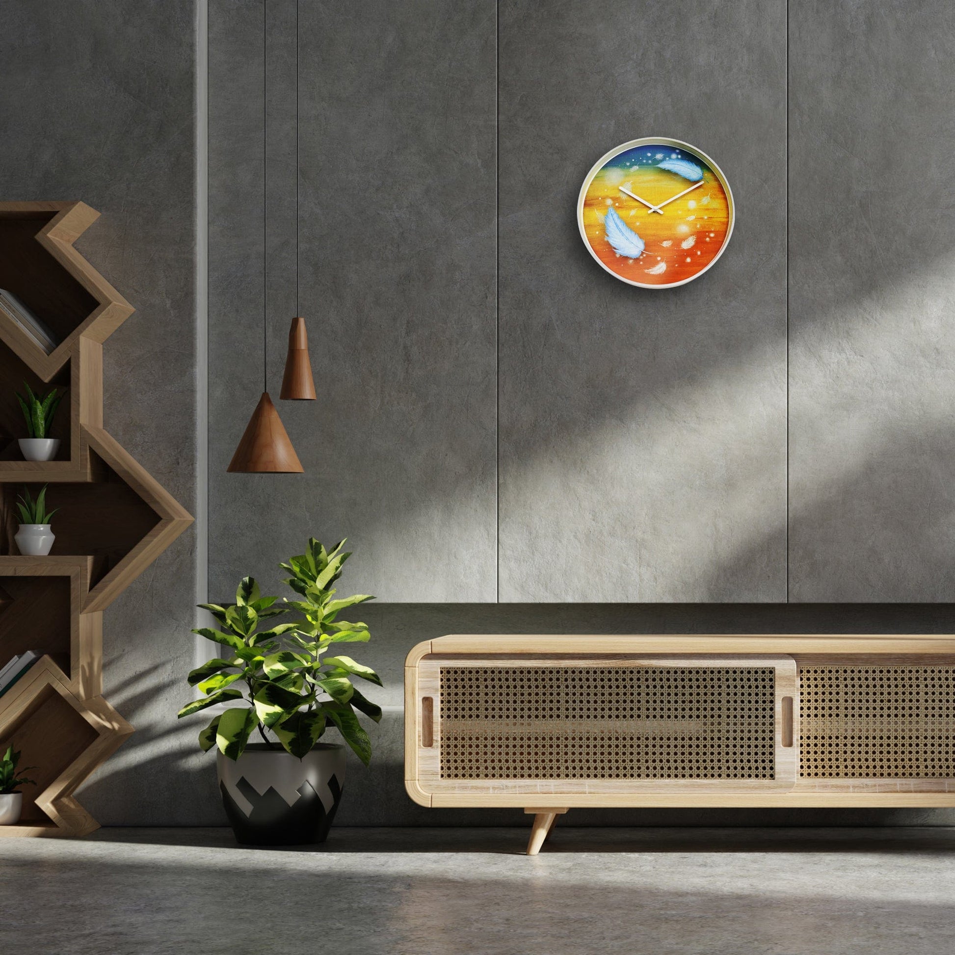 NeXtime's Feathers silent wall clock (30cm) is an artpiece depicting feathers swirling on top of a golden sky. Designed by WENergy, the silk-screening at dual levels creates an illusion of motion that leads your mind to travel to an imaginary dimension and enjoy a mental escape. This clock uses 1 x AA battery (not included).