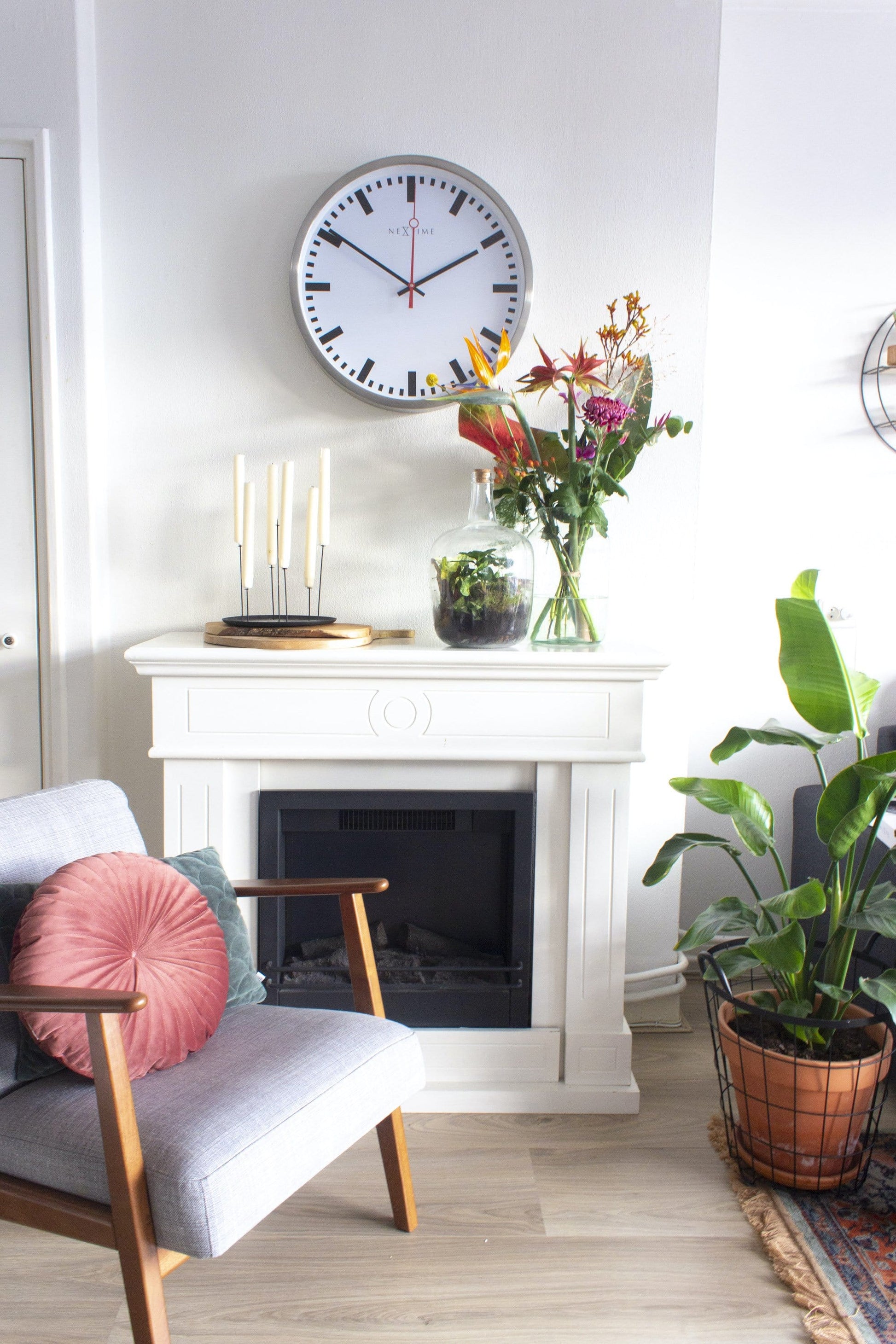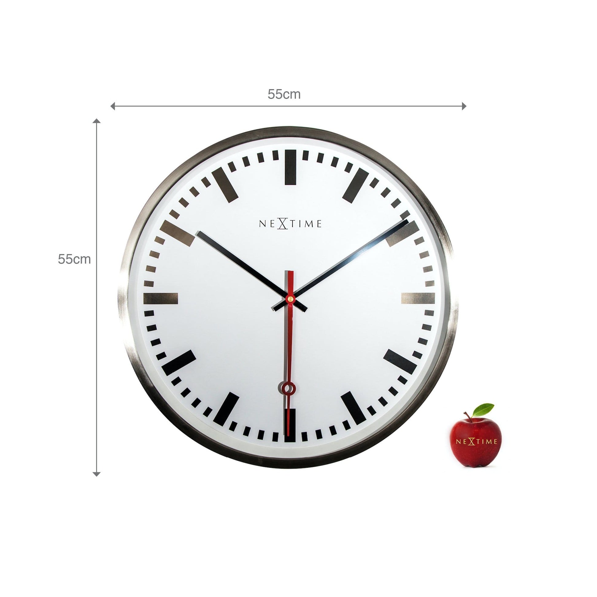 The NeXtime "Super Station" is a large wall clock made of an aluminium case with a brushed finish and a white dial. The hour indication is marked with black stripes. The large red second hand makes this clock unique. The large size of this clock makes it a real eye-catcher. It runs on 1 AA battery (not included).