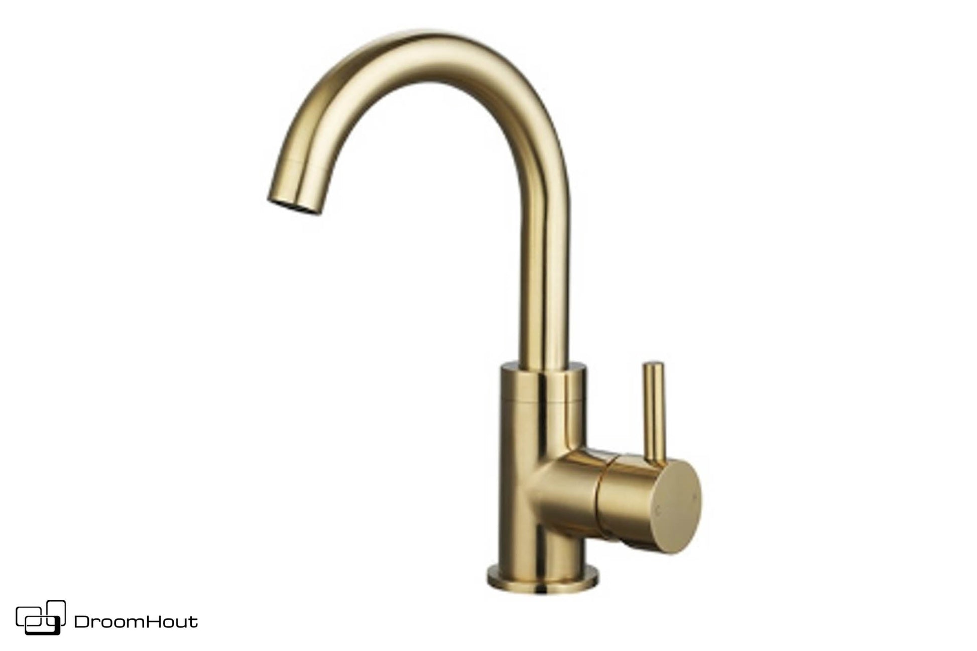 Breng een vleugje elegantie in je badkamer door jou DroomHout badkamermeubel te combineren met de goud geborstelde wastafelmengkraan van Droomhout. Deze prachtige kraan is vervaardigd uit massief messing en voorzien van een hoogwaardige geborstelde goudafwerking. Het subtiele, warme goud voegt een luxe uitstraling toe en past perfect in zowel moderne als klassieke badkamerinterieurs.