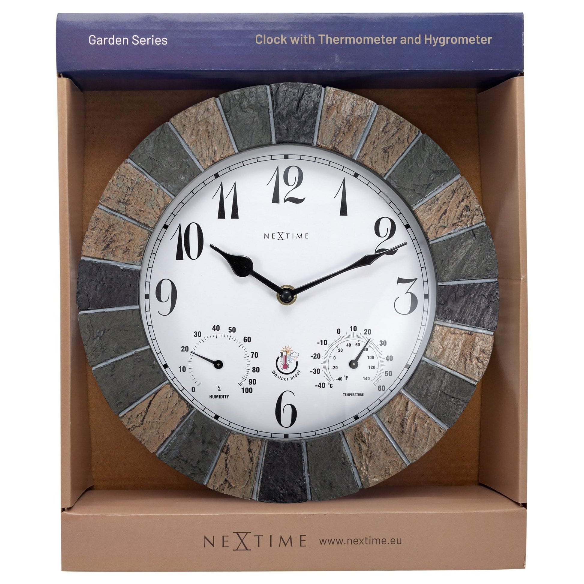 The NeXtime "Aster" is a very complete garden clock mate of stone that can be used outside. The use of extra rubber rings to protect the water from reaching the delicate parts of the clock is making this clock special and weather proof. The clock is robust and classy because of the stone look. It will fit every garden perfectly and blend in easily. With its size of 26cm, it can fit everywhere. If you want to be up to date in your garden, this is the clock for you! Time, temperature and humidity in 1 device. The dial is white and has a big Arabic index for the hour indication. Because of the black hands, the clock and the meters are easy to read. The clock runs on 1 AA battery (not included).