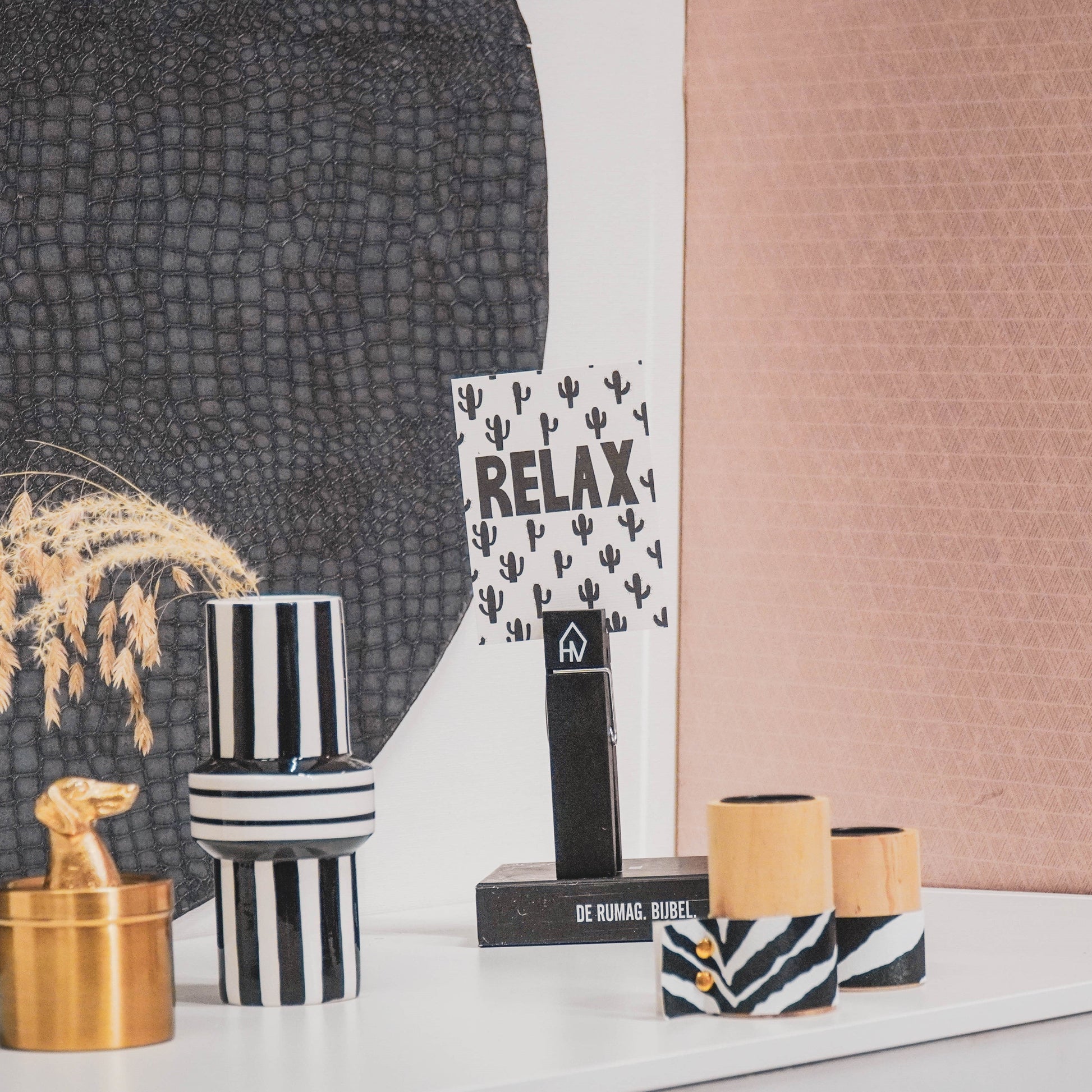 RELAX - Wij houden van quotes, het is gewoon kunst. Ben je op zoek naar een toffe of stoere quote, een mooie afbeelding of een grappige tekst? Dan vind je die sowieso in de Housevitamin collectie van zwart wit post kaarten. De kaarten zijn de finishing touch voor jouw interieur en de leukste post die je naar iemand kan sturen. Deze kaart met 'Relax' is een reminder die velen van ons wel kunnen gebruiken.