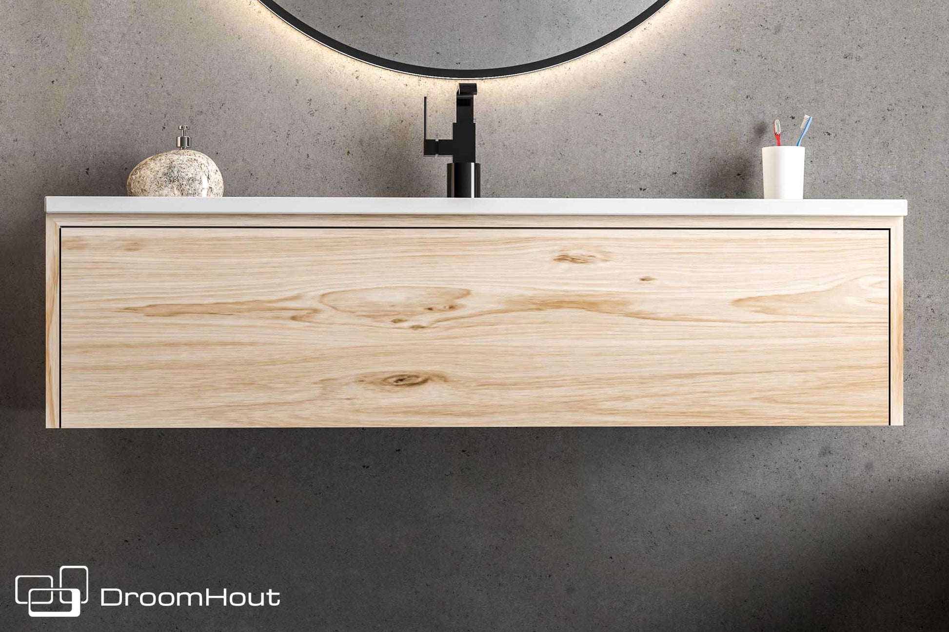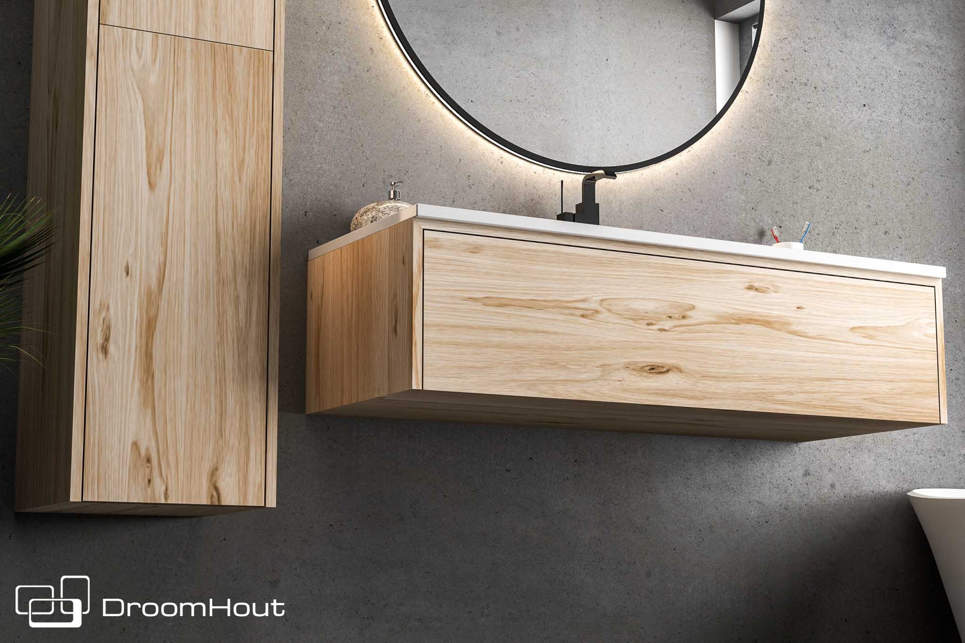 Dit fraaie badkamermeubel is over de volledige breedte voorzien van een praktische en diepe lade van 30 cm. In combinatie met de wasbak geeft dit de lade een binnenmaat van 13 cm hoog. Dit geeft voldoende ruimte voor al je doucheproducten. Wanneer je opzoek bent naar een andere hoogte lade kunnen we dit ook voor je maken. Vraag gerust naar de mogelijkheden. Aan de bovenzijde en beide zijkanten zie je de kopse kanten van het 18 mm dikke massieve Europees eiken. De lade is voorzien van het handige tip-on systeem, waardoor de lade openen een fluitje van een cent is. Dit badkamermeubel Spa is overigens zeer eenvoudig aan de wand te bevestigen door te boren door de vaste rand aan de achterzijde. We leveren de benodigde pluggen en schroeven mee. Het badkamermeubel Spa is verkrijgbaar vanaf de handige maat van 60 cm zodat ook in de kleinere badkamers er een mooi meubel kan hangen. Heb je juist wat meer ruimte tot je beschikking? Dan maken we dit prachtige meubel tot wel 200 cm lengte geheel voor je op maat. En zou je liever twee lades willen? hebben we ook óók aan gedacht. Kijk dan eens naar het badkamermeubel Breeze. Of maak je badkamer gelijk helemaal af met een bijpassende houten badkamerkast.