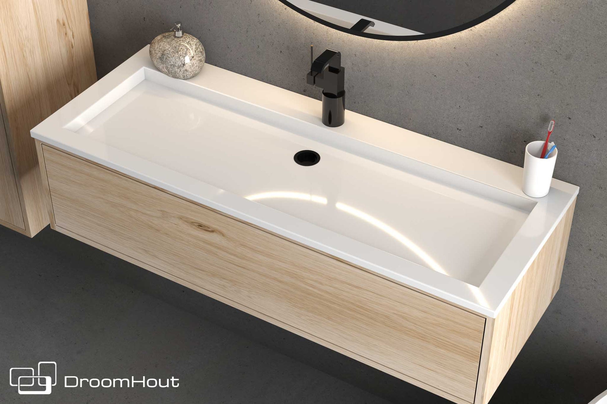 Standaard wordt het badkamermeubel geleverd met de tijdloze keramische wasbak “classic”. De dunne witte rand van 2 cm geeft een mooi contrast op het massieve hout. Hierdoor creëer je dus een echt statement in je badkamer. Om de ruimte in je badkamer optimaal te benutten is het badkamermeubel leverbaar in 60, 80, 100 en 120 cm breed. We leveren de sifon voor je wastafelmeubel mee. Deze is namelijk ruimte besparen en je weet zeker dat het past. Zo kom je niet voor verrassingen te staan. De clickwaste wordt niet standaard meegeleverd maar zijn in diverse kleuren bij ons te bestellen.