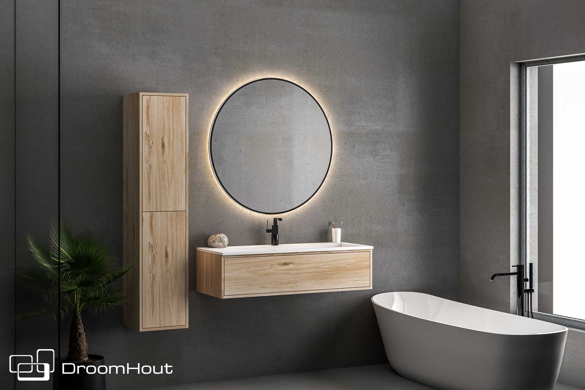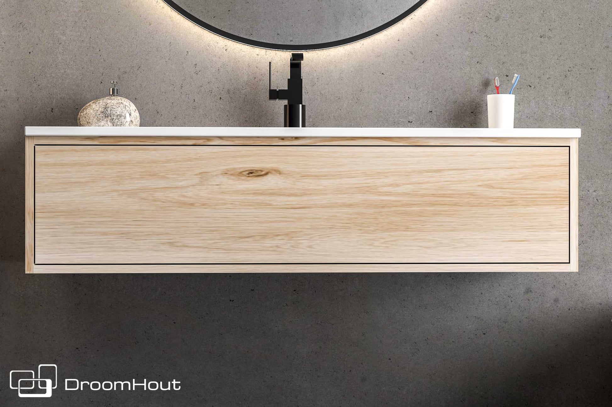 De diepte van het badkamermeubel is standaard 47 cm diep, Dit is een standaardmaat en heeft te maken met de diepte van de bak. De totale hoogte is 32 cm inclusief 2 cm rand en 30 cm lade. Dit geeft je een royale opbergruimte met een binnen hoogte van minimaal 13 cm hoog. Mocht dit niet helemaal zijn wat je zoekt? We kunnen desgewenst ook hogere lades op maat maken. Of kijk ook eens naar onze andere houten badkamermeubels. Misschien is een meubel met latten frontjes iets voor jouw zoals het houten badkamermeubel Palm.
