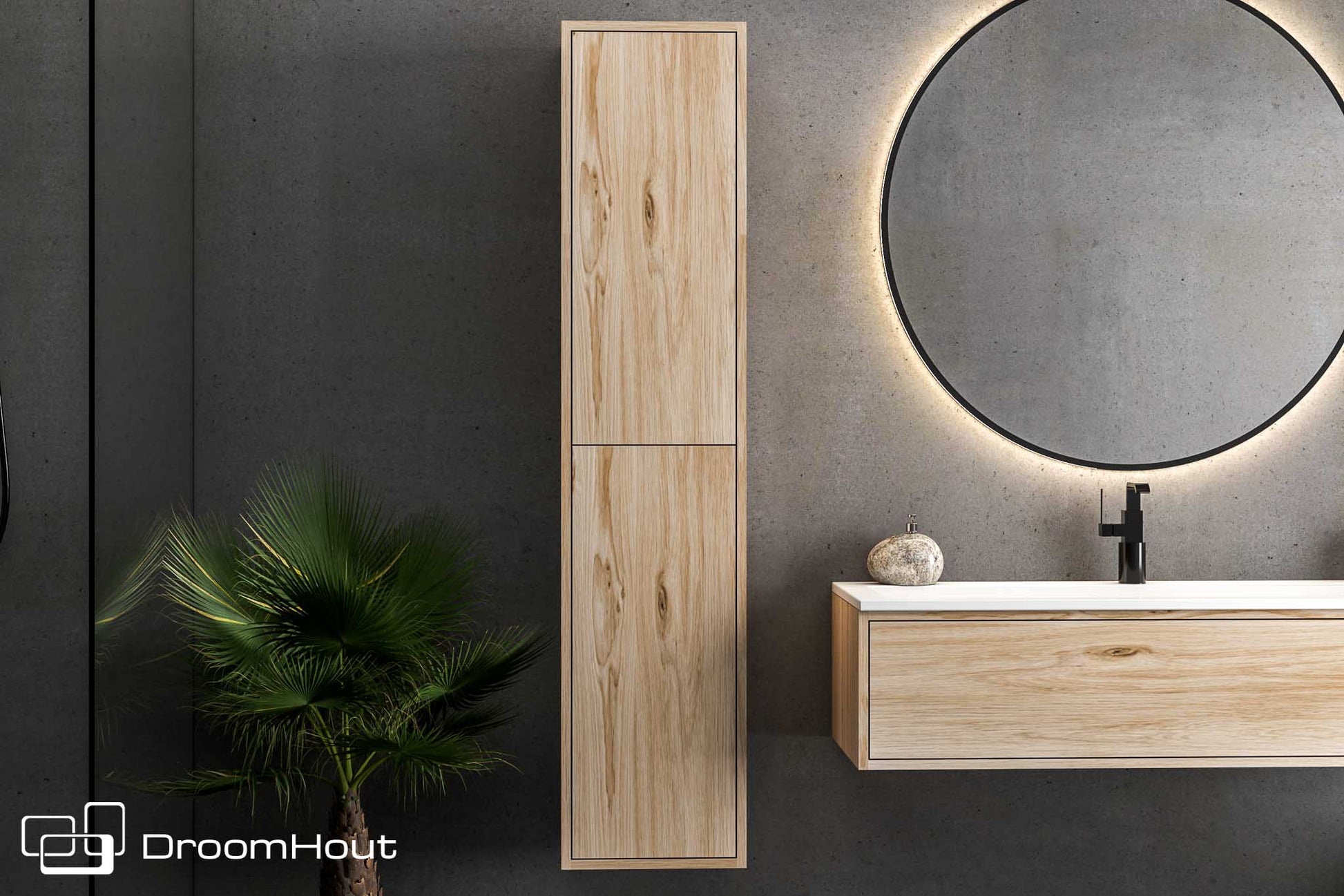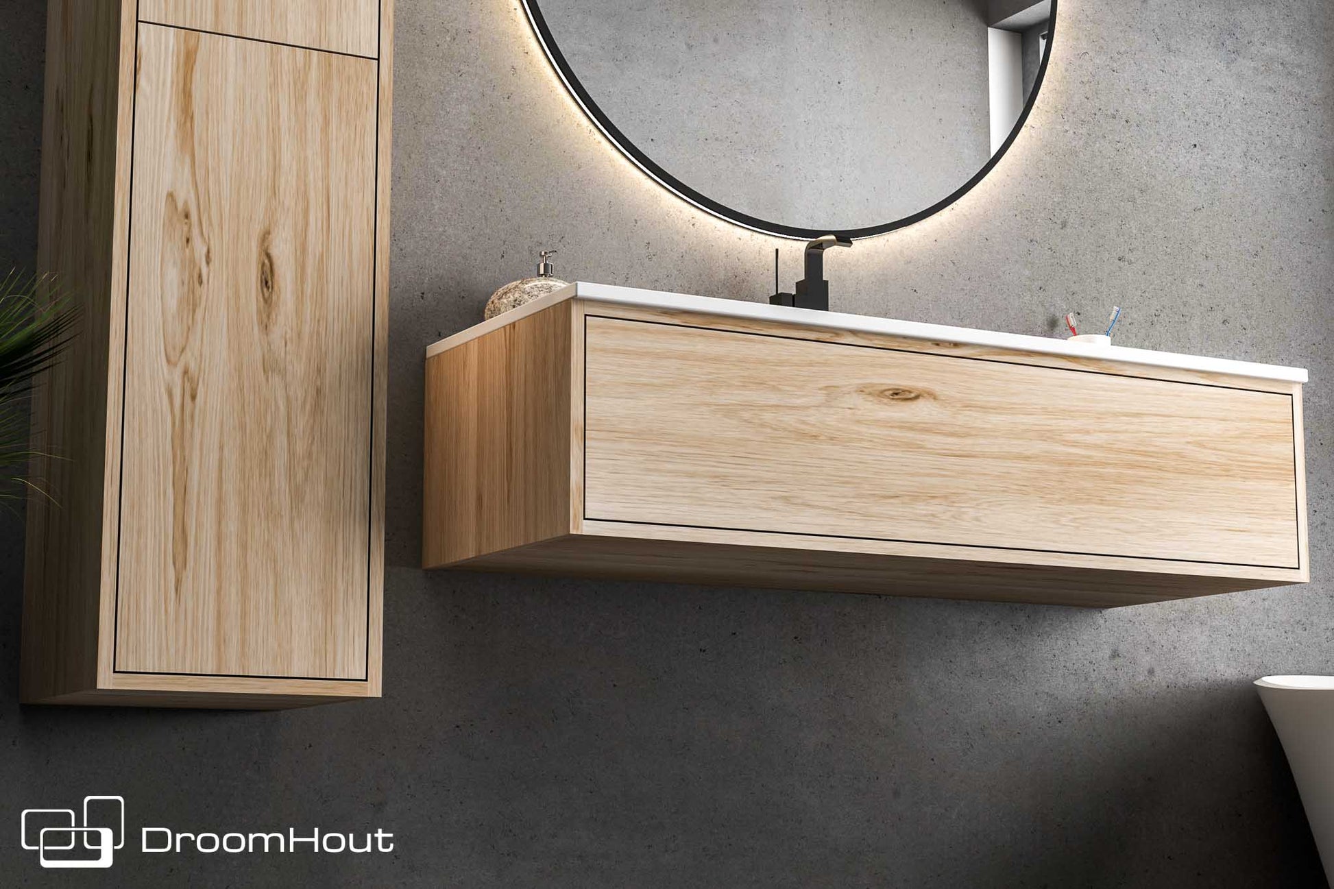 Niet genoeg ruimte? Of wil je nog meer badkamerinspiratie? Het houten badkamermeubel Sunrise maken we ook met twee laden en heet dan badkamermeubel met 2 lade Silence. Ideaal voor als je iets meer ruimte nodig hebt. Om het helemaal af te maken kun je tevens kiezen voor een bijpassende houten badkamerkast uit massief eiken- of noten hout. Dat maakt de look toch helemaal af?