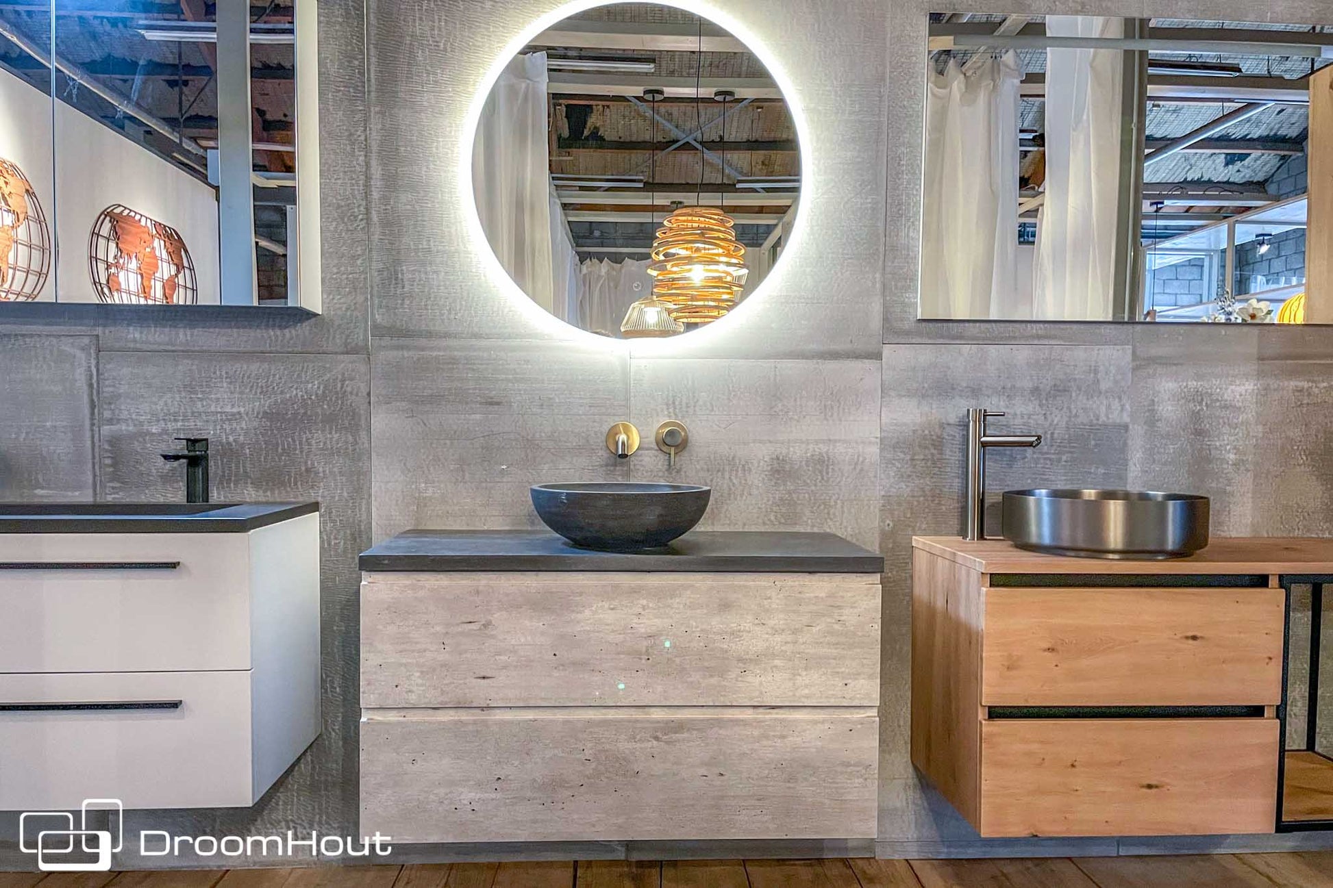 De badkamerspiegel Circle is ook verkrijgbaar met een mat zwarte of goud geborstelde rand. En ook in gun metal of brons. Mat zwart is leuk om te combineren met een zwarte kraan en wasbak bijvoorbeeld. Het mooie van deze spiegel is dat het licht achter de spiegel vandaan komt, dit geeft een sfeervolle achtergrond verlichting. De goudgeborstelde rand van de spiegel staat super bij een badkamermeubel van eikenhout, check het badkamermeubel Soap bijvoorbeeld of het badkamermeubel Ocean. Let wel, in verband met breekbaarheid slechts af te halen, de spiegel wordt niet bezorgd.