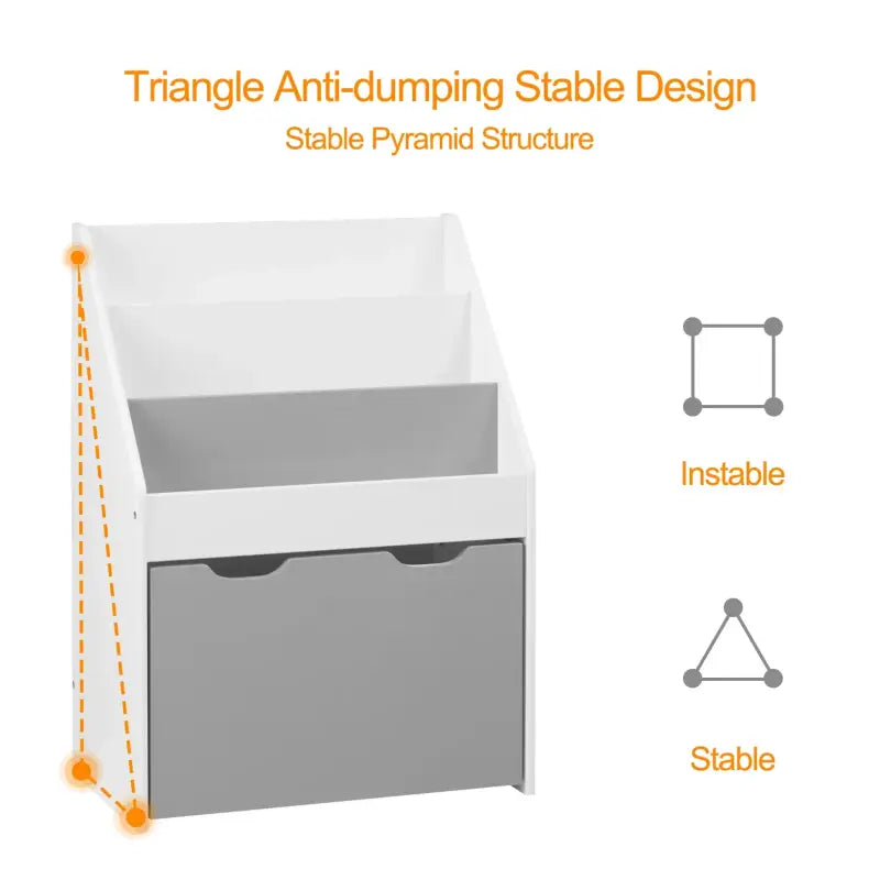 Deze kinderboekenkast is gemaakt van hoogwaardig E1 klasse MDF en is afgewerkt met watergedragen verf, waardoor het zowel duurzaam als milieuvriendelijk is. De afgeronde randen en hoeken zorgen voor extra veiligheid, waardoor u zich geen zorgen hoeft te maken over mogelijke ongelukken. Dankzij de trapeziumvormige structuur staat de kast stevig op de grond, wat bijdraagt aan de stabiliteit en voorkomt dat de kast omvalt.