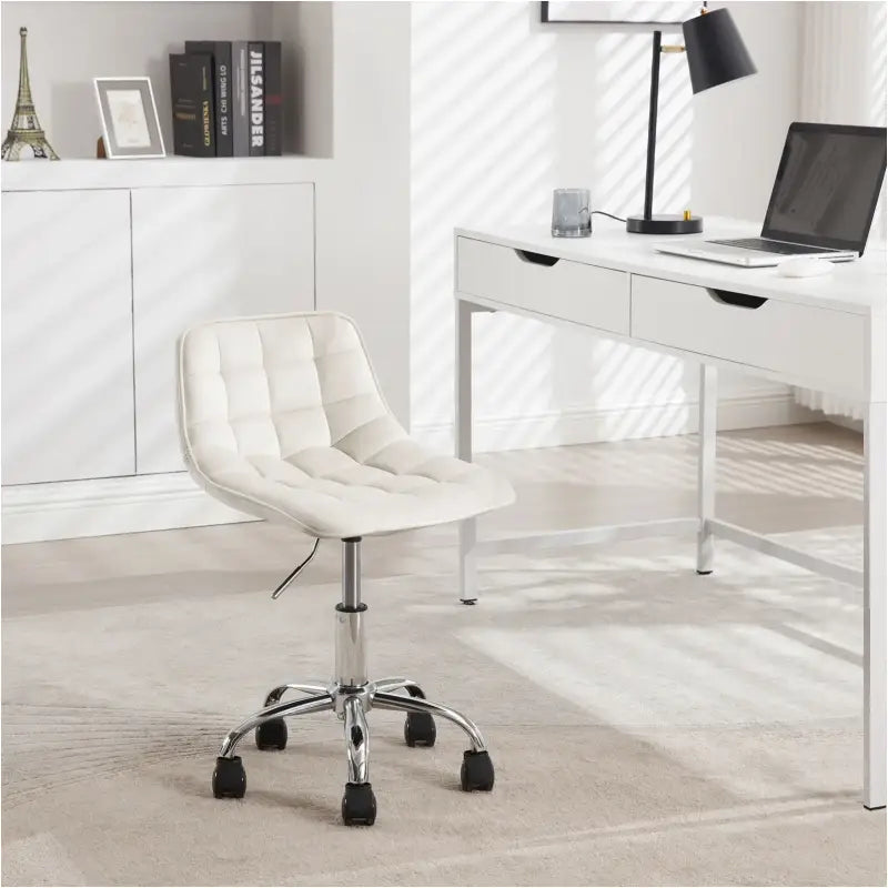Het ergonomische ontwerp van de stoel zorgt voor een goede ondersteuning van je lichaam. De gebogen rugleuning past zich aan de vorm van je lichaam aan, terwijl de zitting 360° draaibaar is en in hoogte verstelbaar van 40 tot 47,5 cm. Met een stevig metalen onderstel met vijf sterren en slijtvaste PU-wielen biedt deze stoel stabiliteit, duurzaamheid en geruisloze mobiliteit, terwijl de vloer beschermd blijft.