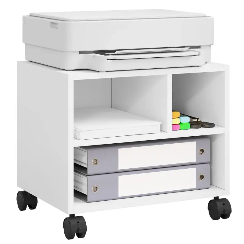 De BukkitBow Houten Kantoorkast / Printerkast met 3 Vakken en Wielen biedt voldoende ruimte en opbergmogelijkheden om uw kantoor georganiseerd te houden. Met één lade voor de printer en drie open compartimenten van verschillende groottes voor kantoorbenodigdheden zoals kopieerpapier, notitieboekjes, nietmachine, enzovoort, helpt deze kast om alles netjes op zijn plaats te houden.