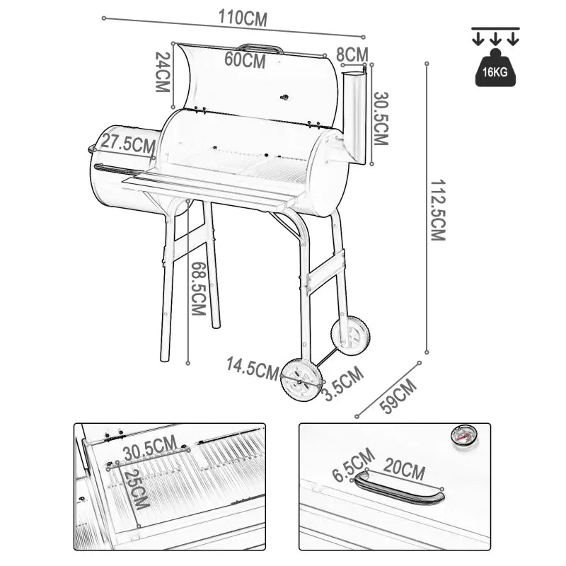 Ervaar het ultieme barbecuegenot met de BukkitBow Houtskoolbarbecue. Deze barbecue, gemaakt van hoogwaardig staal, combineert duurzaamheid met uitstekende prestaties. Met een totale afmeting van 115 x 53 x 114 cm en drie grillroosters van elk 25 x 30 cm, biedt deze barbecue voldoende ruimte om heerlijke gerechten voor een groot gezelschap te bereiden. De warming surface van 25 x 21.5 cm houdt je gerechten warm, zodat je kunt blijven grillen zonder onderbreking. Geniet samen met familie en vrienden van de perfecte barbecue-ervaring.