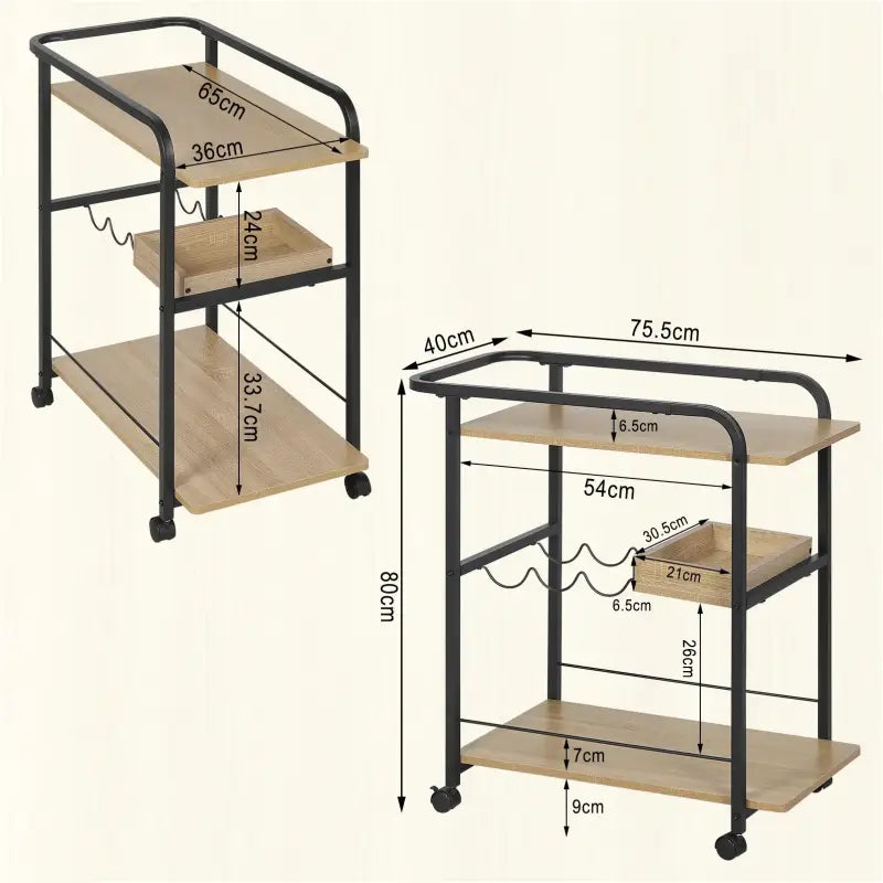 BukkitBow - Industriële Keukentrolley met Wijnrek en Verwijderbare Plank - 76.3x80x40cm