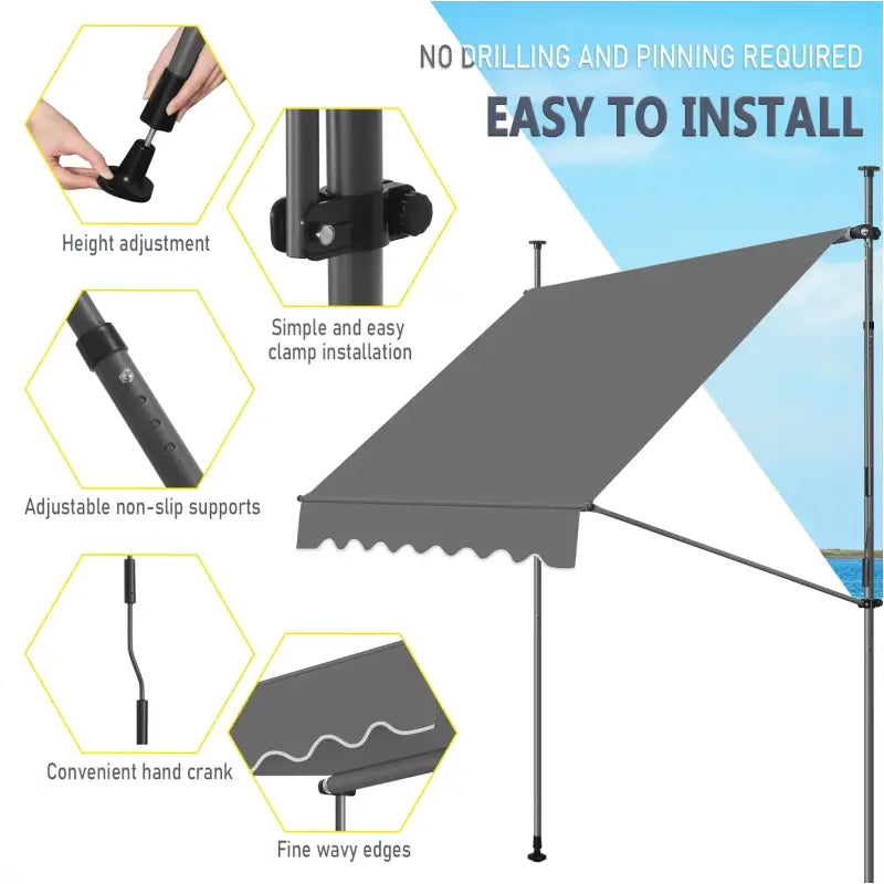 Dankzij de weerbestendige PA-coating biedt deze luifel effectieve UV-bescherming en vermindert het de schittering van de zon, terwijl het ook de warmte in de schaduw vermindert en je privacy beschermt tegen nieuwsgierige blikken. Met een hoogteverstelbereik van 200-300 cm en een kantelhoekbereik van 0-90°, kun je de luifel eenvoudig aanpassen aan je behoeften en de positie van de zon. Het handige handzwengelmechanisme maakt het mogelijk om het doek gemakkelijk in en uit te trekken, waardoor je ruimte bespaart wanneer de luifel niet in gebruik is.