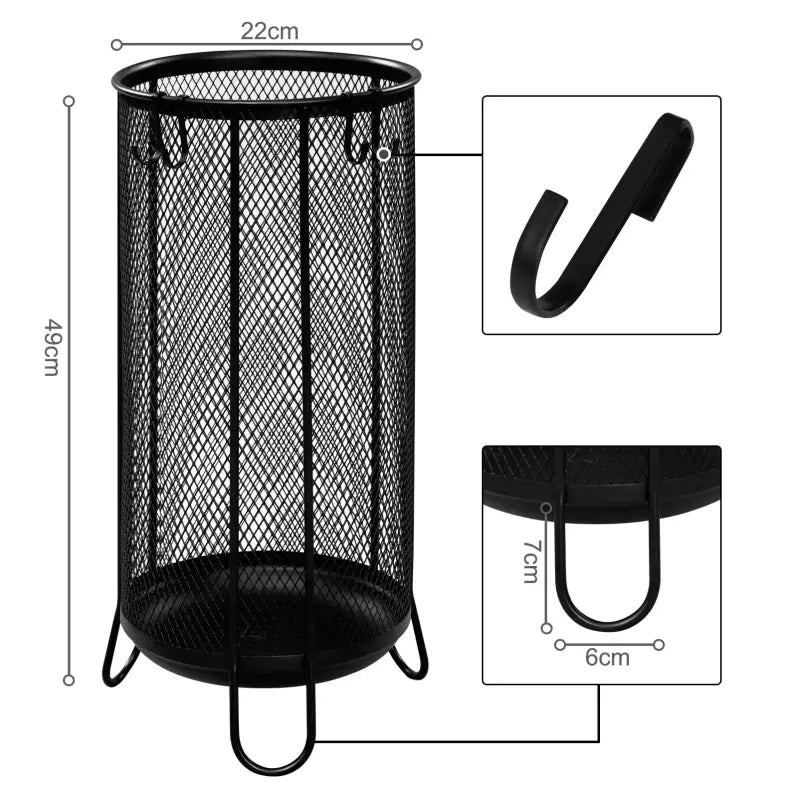 Deze paraplubak is niet alleen functioneel, maar ook praktisch ontworpen. De vaste lekbak op de bodem voorkomt dat regenwater op de vloer druipt, terwijl het metalen roosterontwerp zorgt voor ventilatie, waardoor het sneller droogt en schimmelvorming wordt voorkomen. Met vier extra haken aan de buitenkant kun je inklapbare paraplu's ophangen voor gemakkelijke toegang. Van de entree tot de kantoorruimte, deze paraplubak past perfect bij elke omgeving.