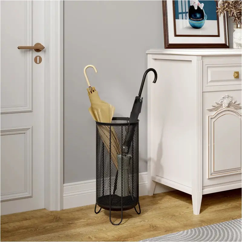 Met een hoogte van 49 cm en een diameter van 23 cm biedt deze paraplubak voldoende ruimte voor 4 tot 6 paraplu's. De stevige metalen constructie en de drie U-vormige poten zorgen voor stabiliteit en duurzaamheid, terwijl ze de vloer beschermen tegen krassen.