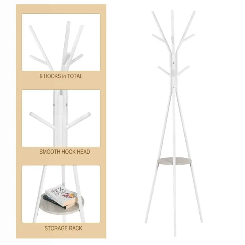 De kapstok is voorzien van een driepotige basis die zorgt voor stabiliteit, zelfs bij het dragen van zware kledingstukken. De ronde plank aan de bovenkant biedt niet alleen extra versterking voor de kapstok, maar kan ook worden gebruikt om decoratieve items zoals een telefoon, handtas, of fotolijstje op te plaatsen. Met zijn veelzijdigheid en duurzaamheid is deze kapstok geschikt voor verschillende ruimtes, waaronder ingangen, slaapkamers, woonkamers, kantoren en hotelkamers.