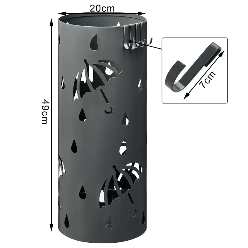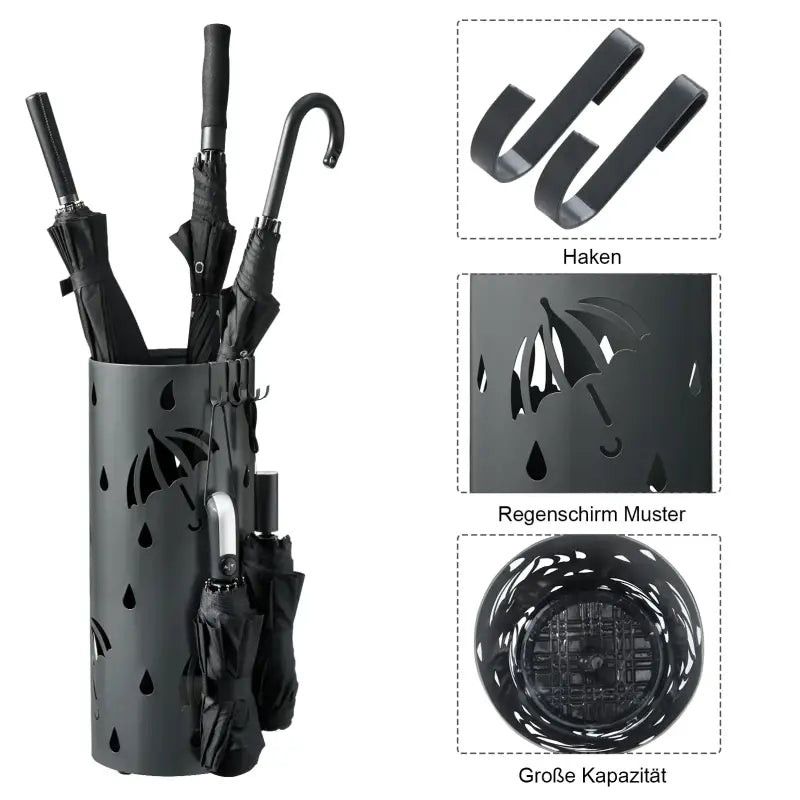 De paraplustandaard wordt geleverd met een verwijderbare plastic lekbak om water op te vangen en je vloeren te beschermen tegen vocht. Met 4 haken voor het ophangen van opvouwbare paraplu's biedt deze standaard niet alleen een oplossing voor het opbergen van paraplu's, maar kan hij ook worden gebruikt voor wandelstokken en trekkingstokken. Perfect voor in de hal, keuken, woonkamer of kantoor, neemt deze paraplustandaard weinig ruimte in beslag en voegt het een vleugje elegantie toe aan elke ruimte.