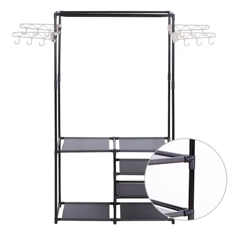 Het BukkitBow Multifunctioneel Kledingrek is vervaardigd met hoogwaardige materialen zoals PP kunststof, roestvrij staal en non-woven stof. De stevige stalen buis met een dikte van 18 mm zorgt voor een stabiele ondersteuning van het gehele draagvermogen. Met een belasting van 12-16 kg voor de kledingrail en 8 kg voor elk klein compartiment, biedt dit kledingrek duurzaamheid en betrouwbaarheid voor langdurig gebruik.