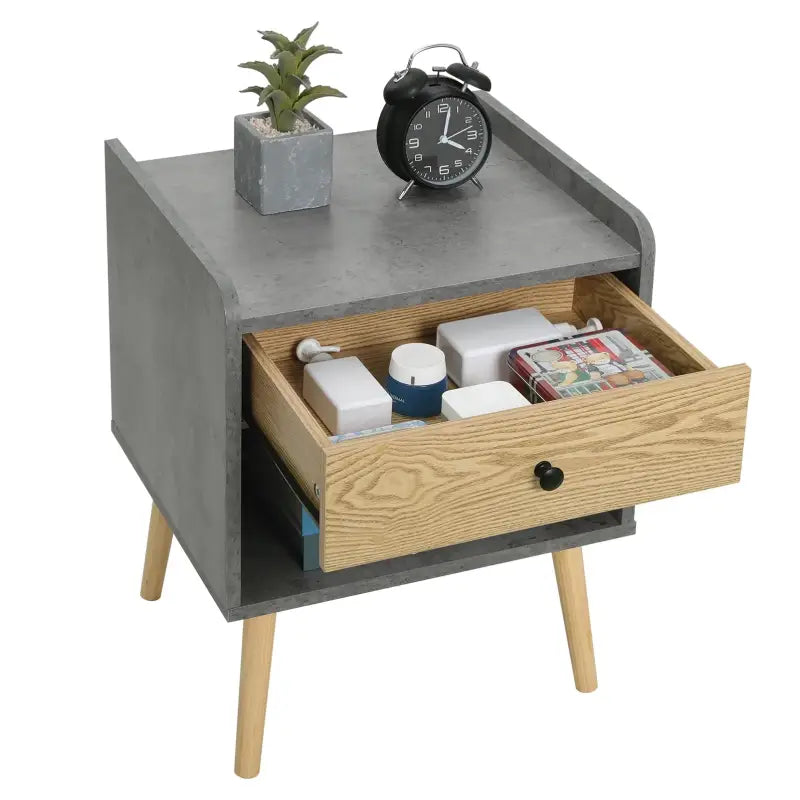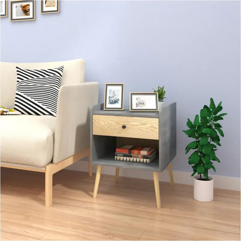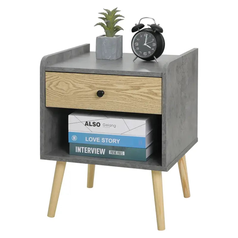 BukkitBow - Nachtkastje met Lade - Sterk Hout met Massief Houten Poten - Grijs met Licht Eikenhout - Max Belasting: 30kg - 44x55.7x41cm