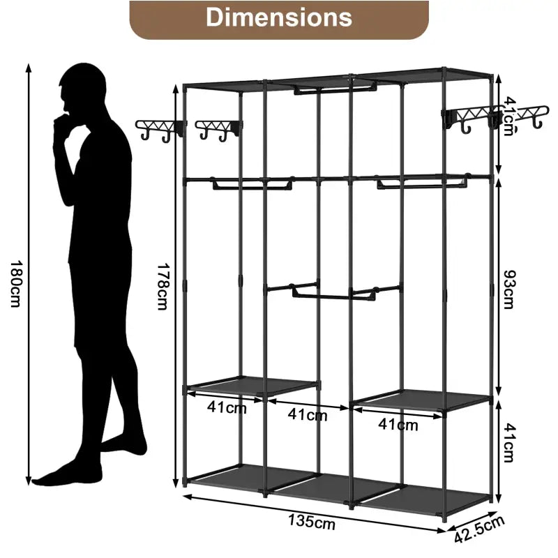 De BukkitBow Open Kledingkast biedt een ruime en stijlvolle oplossing voor uw kledingopbergbehoeften. Met afmetingen van 135 x 178 x 42.5 cm combineert deze kast functionaliteit met design, perfect voor elke ruimte van de hal tot de slaapkamer. De kast is uitgerust met verschillende opslagzones voor zowel lange als korte kledingstukken, legplanken voor kleding en beddengoed, en haken voor accessoires zoals tassen, sjaals en hoeden. Deze open kast, uitgevoerd in elegant zwart, biedt niet alleen een overzichtelijke opslag maar verrijkt ook de uitstraling van uw interieur.
