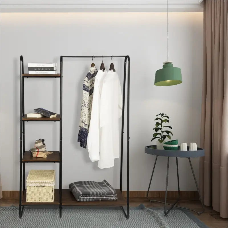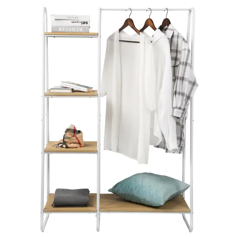 Dit open kledingrek van BukkitBow biedt niet alleen een praktische oplossing voor het organiseren van uw garderobe, maar dient ook als een stijlvolle toevoeging aan elke kamer. Met vier opbergplanken kunt u uw diverse items verbergen en tegelijkertijd uw favoriete items tentoonstellen. Of het nu gaat om jassen, shirts, schoenen, dozen, tassen, boeken of tijdschriften, dit kledingrek biedt voldoende ruimte om alles georganiseerd te houden.