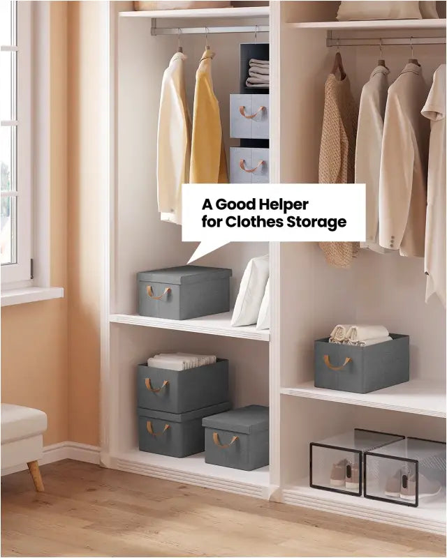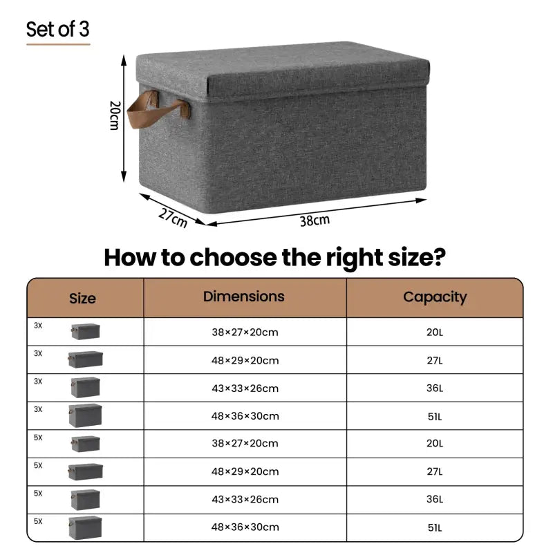 Elke opbergdoos is uitgerust met een handig deksel dat je kunt openen om eenvoudig toegang te krijgen tot de inhoud of om je spullen te beschermen tegen stof en rommel. De praktische handvatten maken het verplaatsen van de dozen een fluitje van een cent, zodat je moeiteloos kunt reorganiseren wanneer dat nodig is. Het ontwerp is doordacht met een ademend polyester stof die bestand is tegen scheuren en slijtage, terwijl de plastic bodemplaat de doos stevig houdt zonder in te boeten op gewicht.