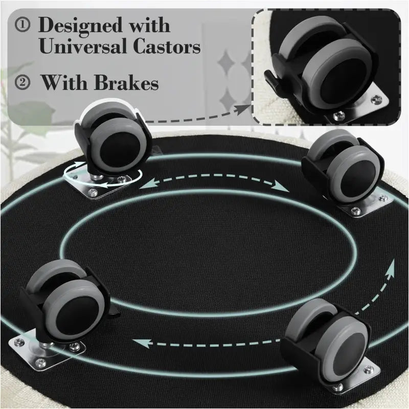 Deze veelzijdige opbergpoef is niet alleen een comfortabele zitplaats, maar functioneert ook uitstekend als schoenenwisselkruk bij de deur, als voetenbankje naast de bank, of zelfs als salontafel in de woonkamer. Uitgerust met vier 360° draaibare wielen, waarvan twee met remmen, biedt de poef moeiteloze mobiliteit. Het verplaatsen van de poef door uw ruimte wordt een fluitje van een cent, waardoor hij perfect is voor dynamische en veelzijdige woonomgevingen. De montage is zeer eenvoudig: bevestig de wielen en uw stijlvolle, mobiele opbergoplossing is klaar voor gebruik!
