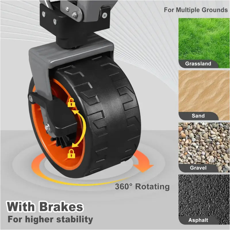 Deze handkar is uitgerust met grote universele wielen van 17,8 cm diameter, die slijtvast en geschikt zijn voor alle terreinen, inclusief gras, modder, zand en grindpaden. De handkar is voorzien van remmen op de voorwielen voor extra stabiliteit en veiligheid, waardoor hij perfect is voor allerlei activiteiten, zoals winkelen, tuinieren, kamperen, stranduitjes en wandelingen.
