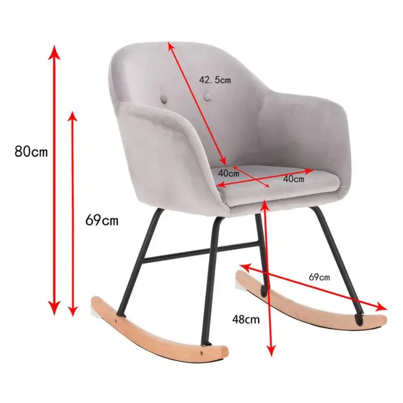Deze schommelstoel combineert een eigentijds ontwerp met ultiem comfort. Met een totale hoogte van ongeveer 80 cm en een zithoogte van 48 cm, biedt de stoel voldoende ondersteuning en comfort. Het zitgedeelte van ongeveer 40 x 40 cm en de goed gevoerde zitting met ergonomische vorm zorgen voor een uitzonderlijk comfortabele en ontspannende zitplaats. De rugleuning van ongeveer 42,5 cm hoog en de armleuningen van ongeveer 69 cm hoog maken de zitervaring compleet.