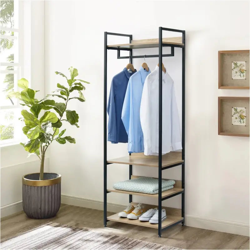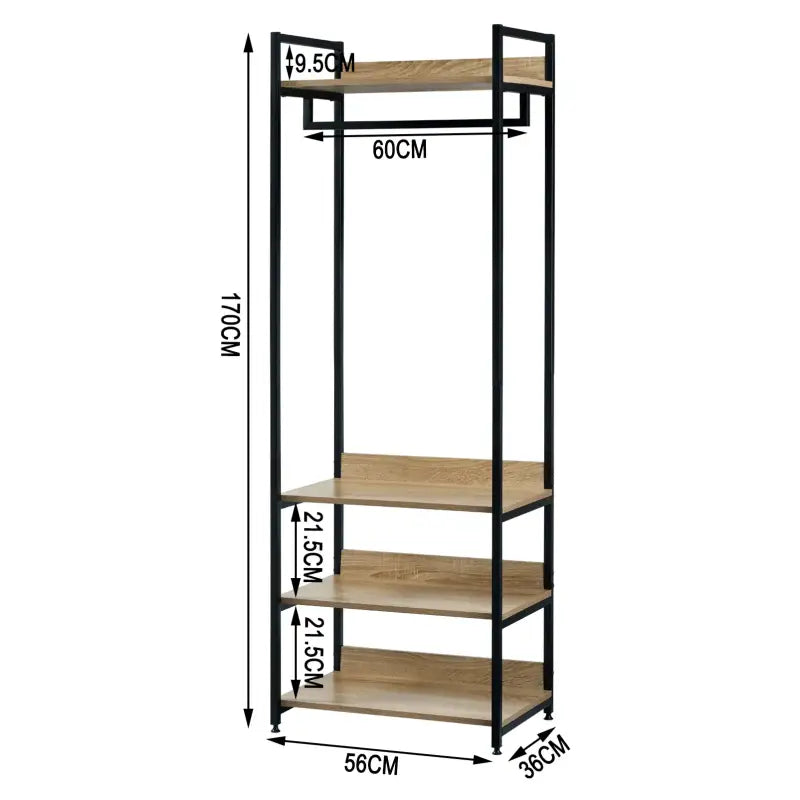Deze staande kapstok van BukkitBow biedt een uitstekende oplossing voor het organiseren van uw kleding en accessoires. Met een combinatie van licht eikenhout en zwart staal past het perfect in elke moderne inrichting. Met afmetingen van 56 x 36 x 170 cm biedt deze kapstok voldoende opbergruimte met zijn drie planken onderaan en een plank bovenaan, evenals een kledingrail om uw jassen op te hangen.