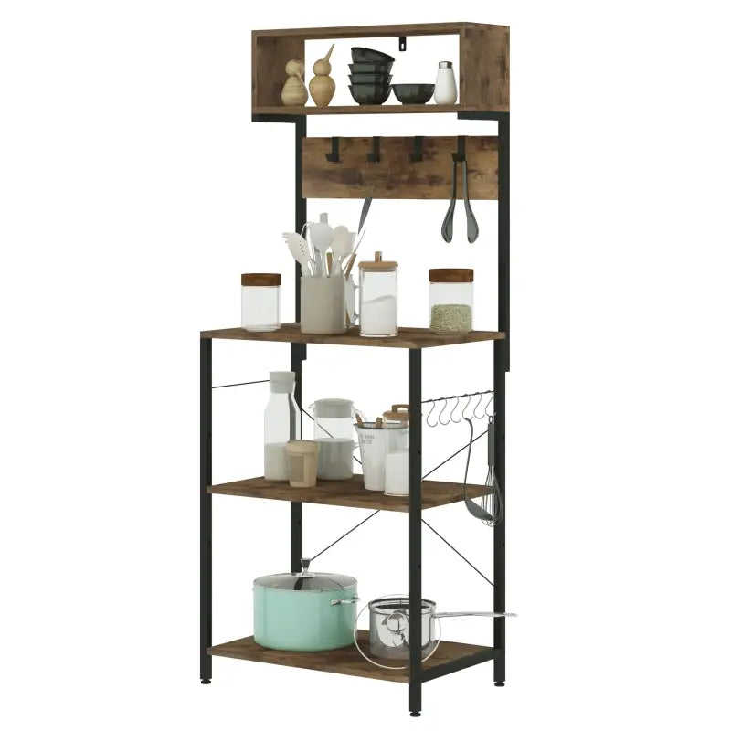 De combinatie van vintage planken en een zwart stalen frame geeft de kast een retro uitstraling die past bij elke interieurstijl. Deze kast kan worden gebruikt in de keuken, woonkamer, hal, slaapkamer, badkamer en meer. De 4 vaste haken en 6 mobiele haken voegen extra opslagmogelijkheden toe, waardoor uw spullen georganiseerd en binnen handbereik blijven.