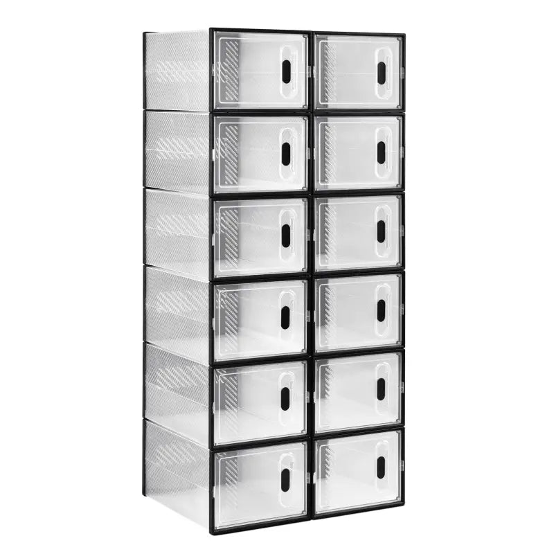 Houd je schoenen netjes, stofvrij en overzichtelijk met deze set van stapelbare schoenendozen. Verkrijgbaar in sets van 8, 12 of 18, ideaal voor sneakerliefhebbers en een georganiseerde kast. Elke doos is voorzien van een transparant voorkantje, zodat je direct ziet welke schoenen erin zitten. Gemaakt van stevig ABS-kunststof in zwart-wit contrast voor een strakke uitstraling.