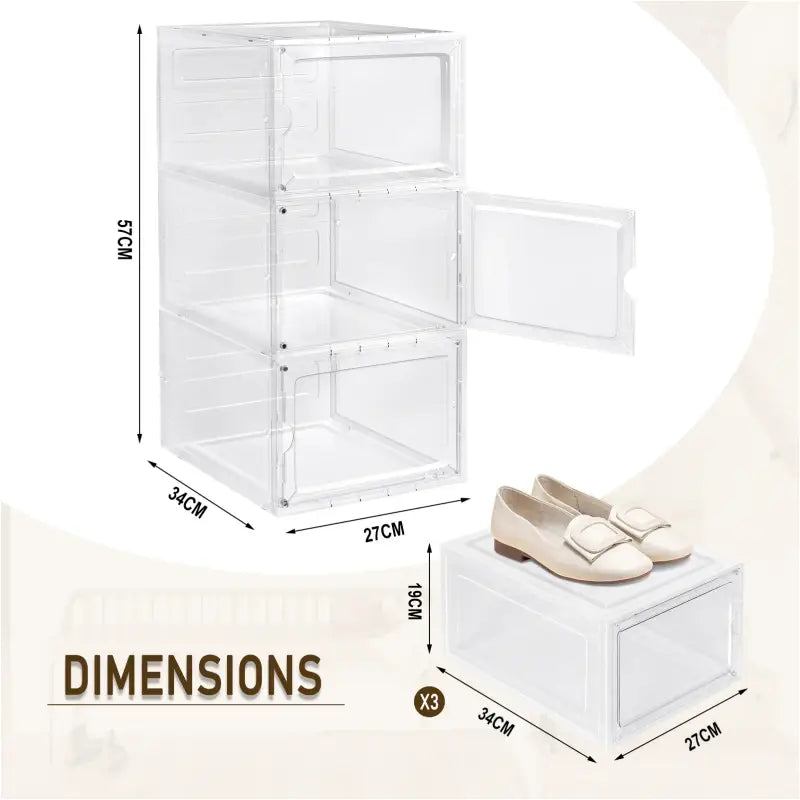 Dankzij het stapelbare ontwerp kunnen de sets van 3 of 6 schoenenopbergdozen eenvoudig op elkaar worden gestapeld of zij aan zij worden verbonden, waardoor je de vorm van je schoenenopslageenheid kunt aanpassen. Dit bespaart kostbare ruimte in je kast of bijkeuken en biedt een handige manier om je schoenen georganiseerd te houden.