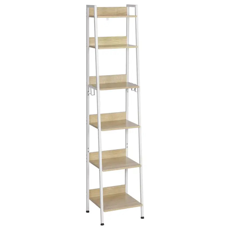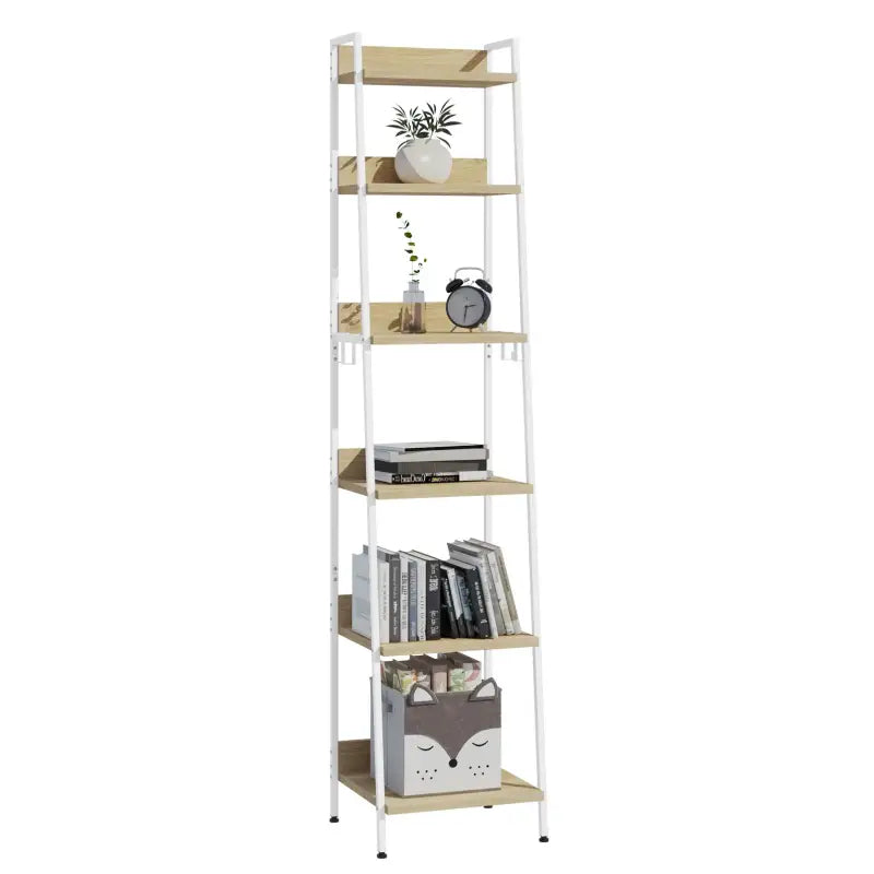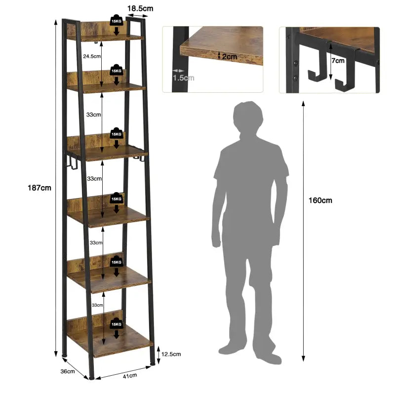 De BukkitBow Stijlvolle Ladderplank/Kast biedt een veelzijdige en praktische opslagoplossing voor uw huis. Met een chique en industriële uitstraling, is deze plank perfect voor de woonkamer, slaapkamer, badkamer of keuken. De 6 open planken bieden voldoende ruimte voor het organiseren van boeken, fotolijsten, potplanten en keuken- en badkamergerei. Het stabiele ontwerp en de extra opberghaken maken deze ladderplank een waardevolle toevoeging aan uw interieur.