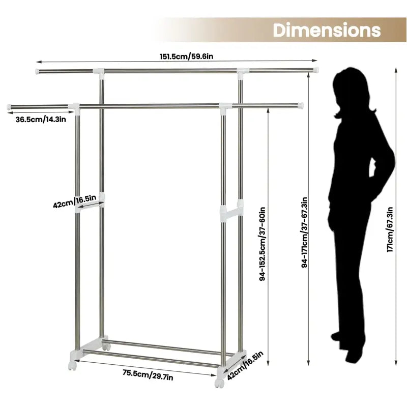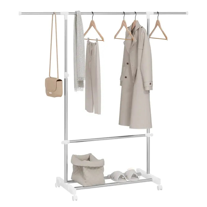 BukkitBow - Uitschuifbaar Kledingrek op Wielen - Roestvrij Staal - Verstelbaar en Draagbaar - Enkele of Dubbele Hangende Stang